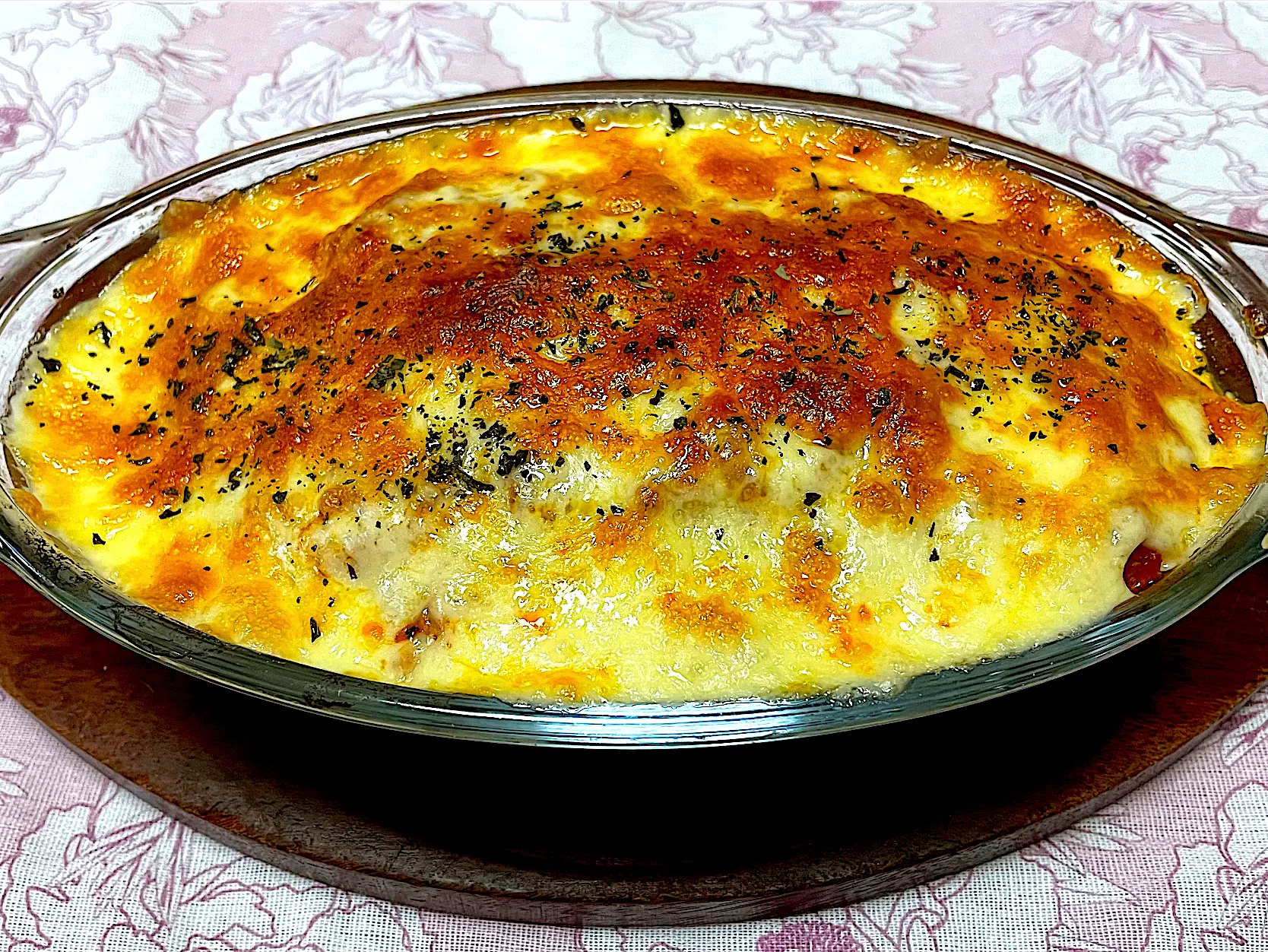 ジャガイモ→マカロニ→ミートチーズの4層🧀