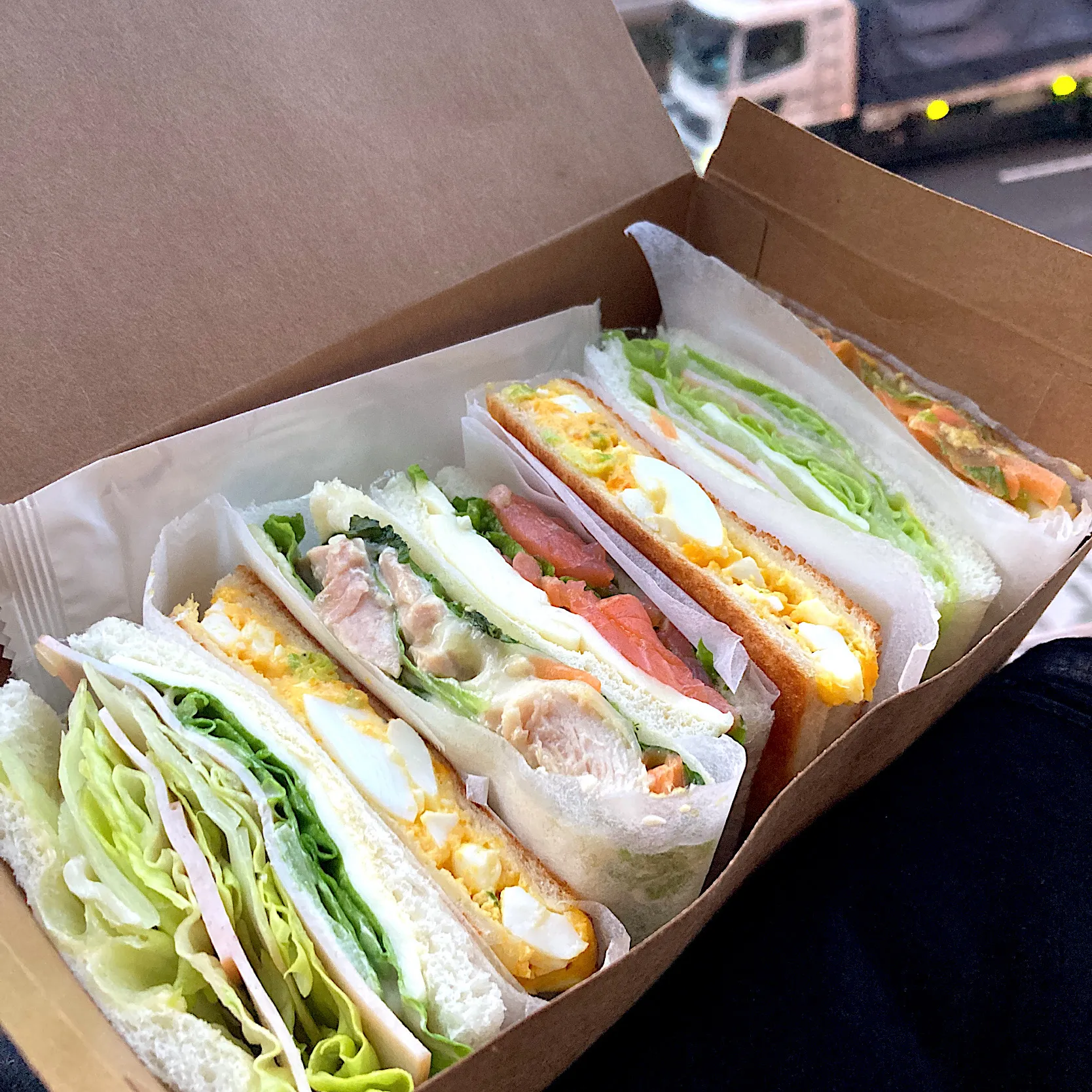 ハムとレタス、タマゴ、スモークサーモンなどのサンドイッチを詰めました。