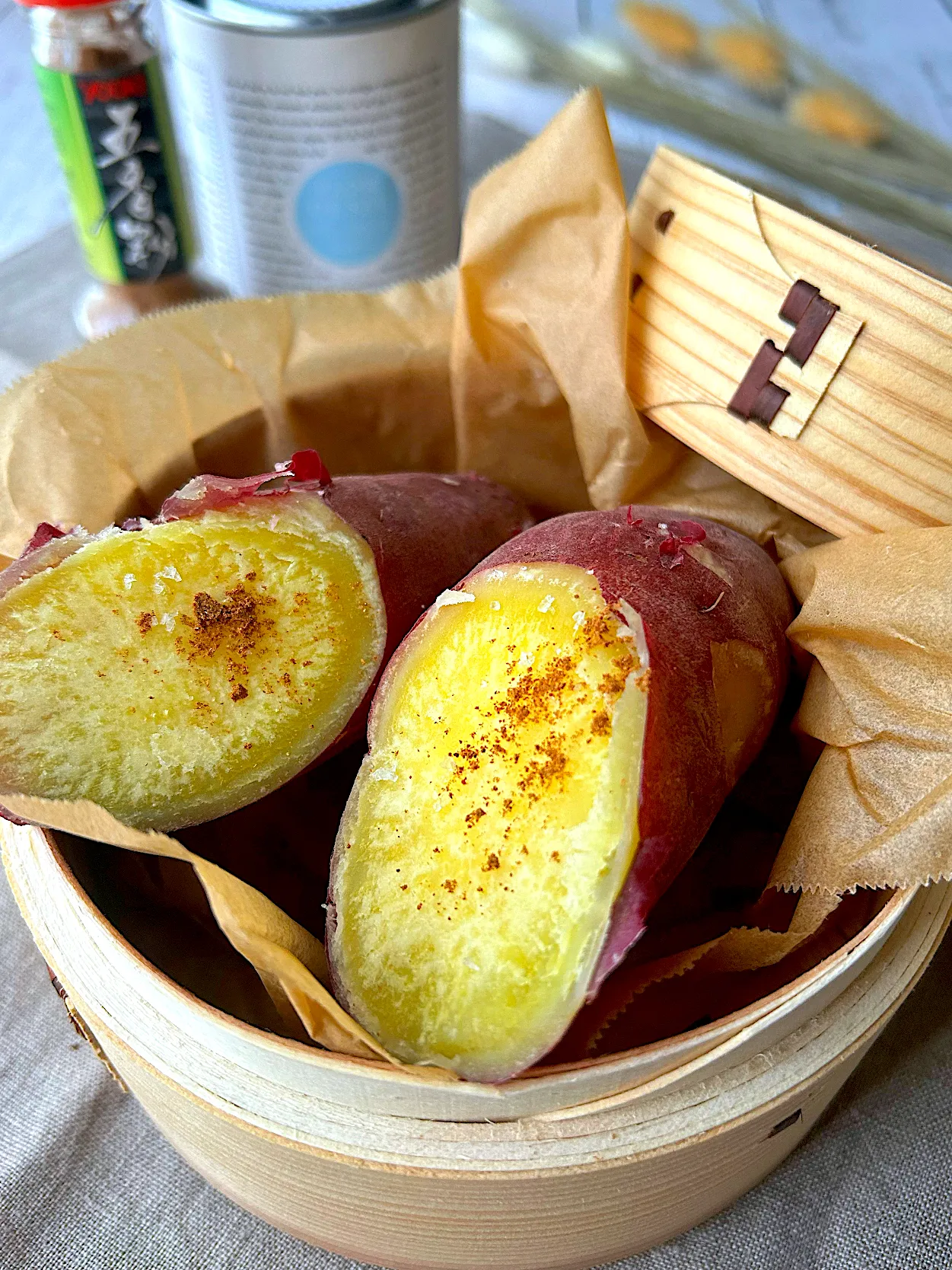 油や乳製品も控えてシンプルに蒸しただけのさつまいもに五香粉とマヨルカ島の塩をそのまま振りかけましたが、バターを加えても美味しいと思います😆