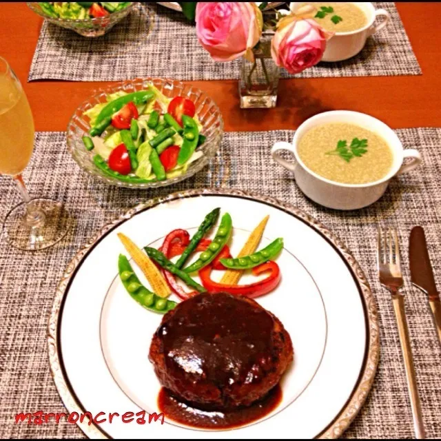 ハンバーグ周りの野菜の飾りもステキ✨