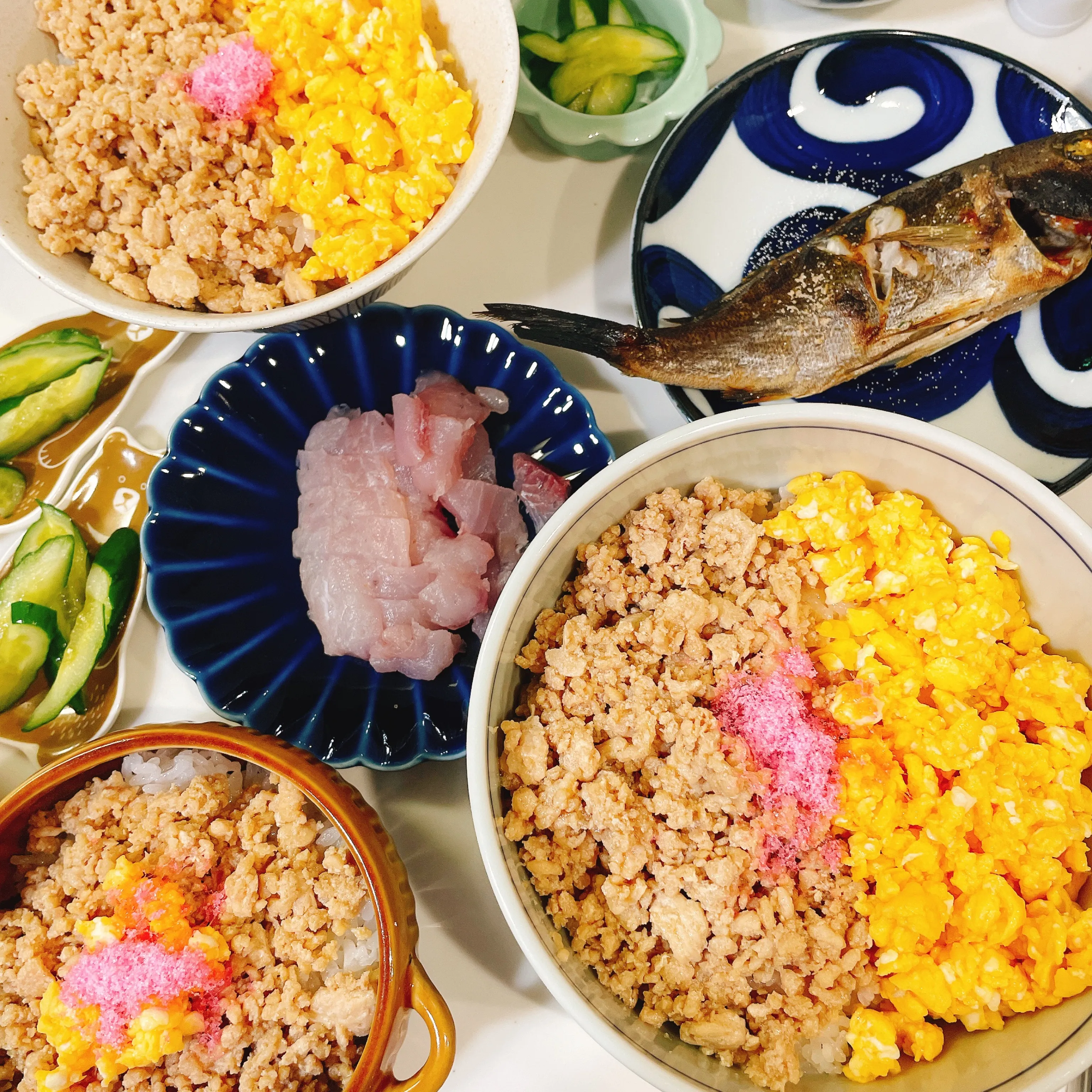 そぼろ丼 がんも煮 レンコンチップ 小松菜煮浸し も...