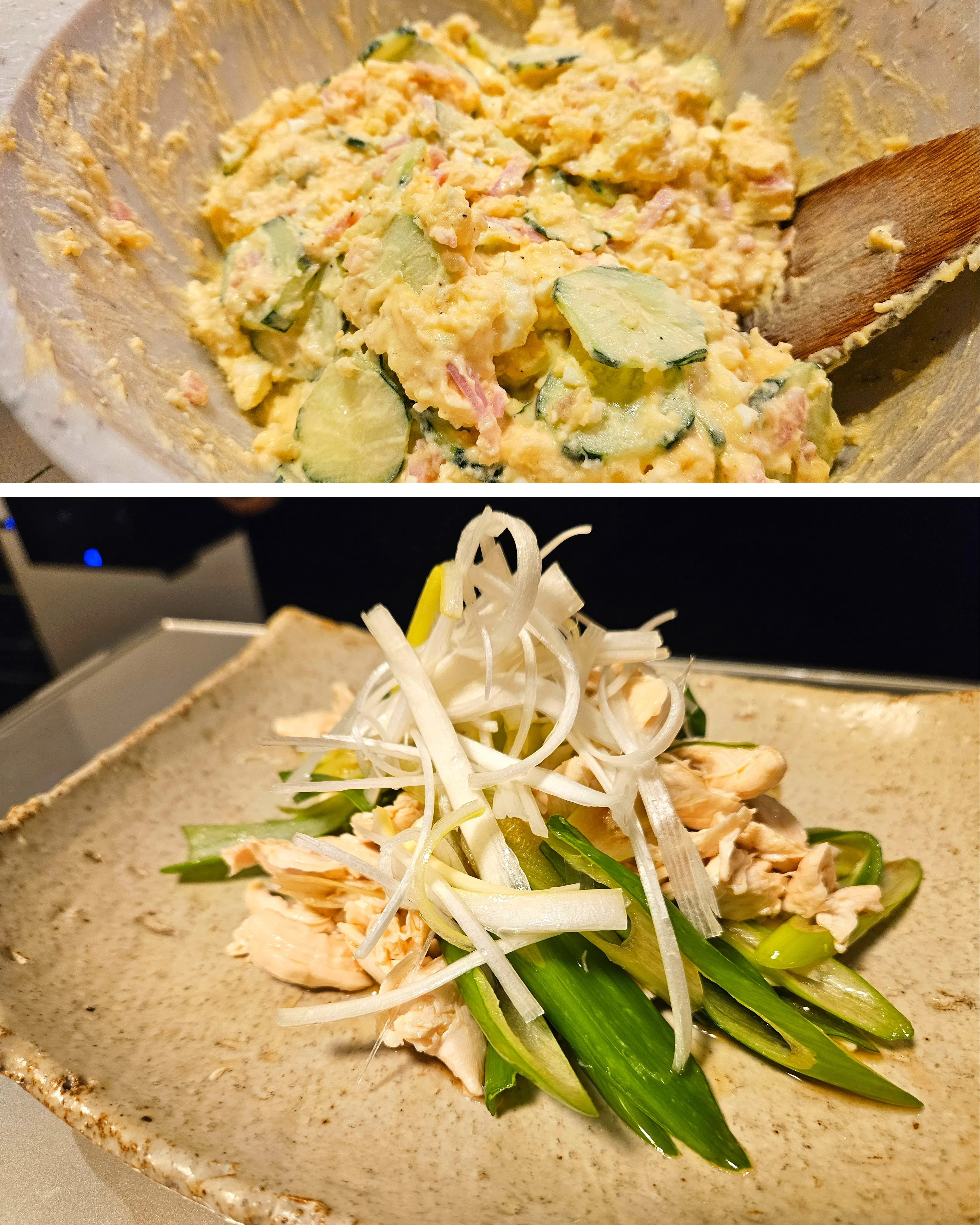 作ったのは鶏ささ身肉と長ねぎを使い、ごま油と岩塩で味付けしたおつまみとポテトサラダです。