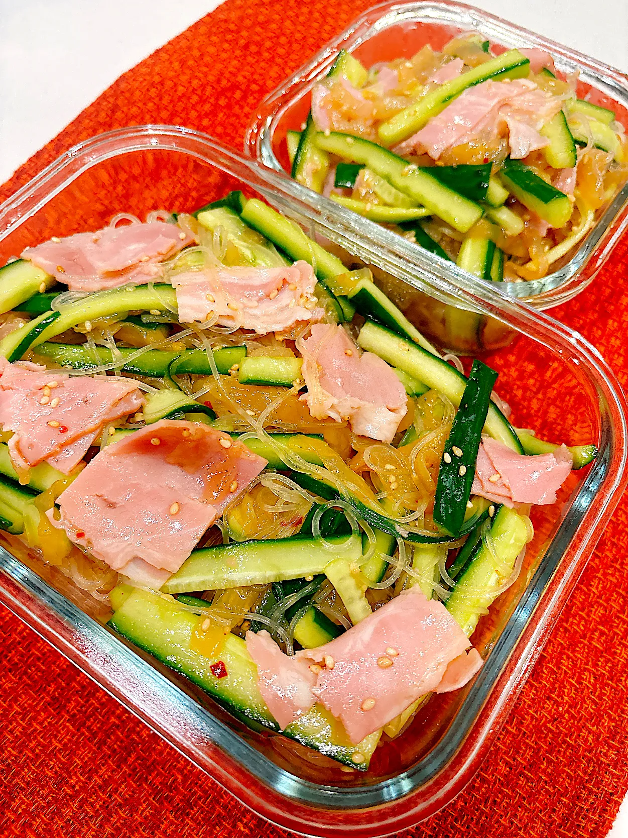 4️⃣ 春雨・ベーコン・千切りきゅうり・ごまを加えて全体をよく和える。