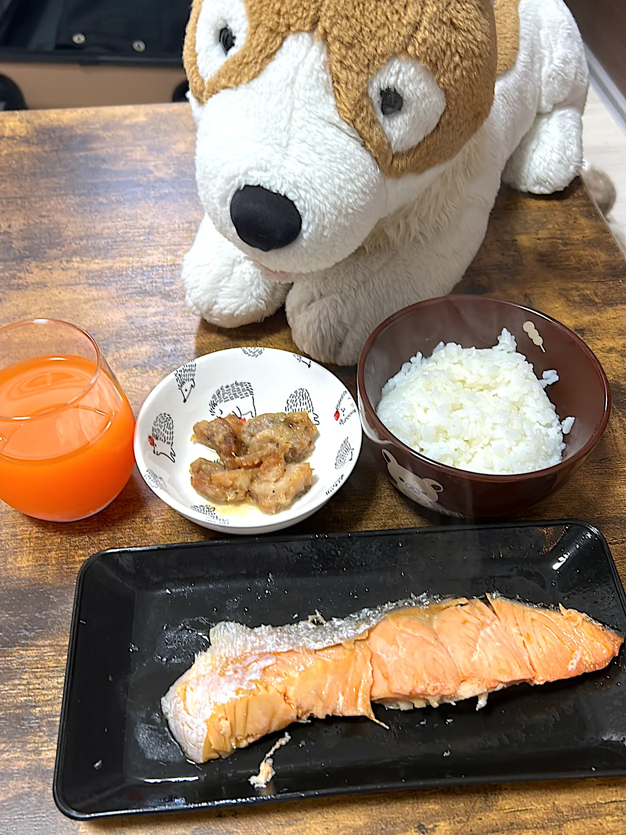 #焼き鮭 #唐揚げ #白米 #野菜ジュース #男子大学生 #人形 #一人暮らし