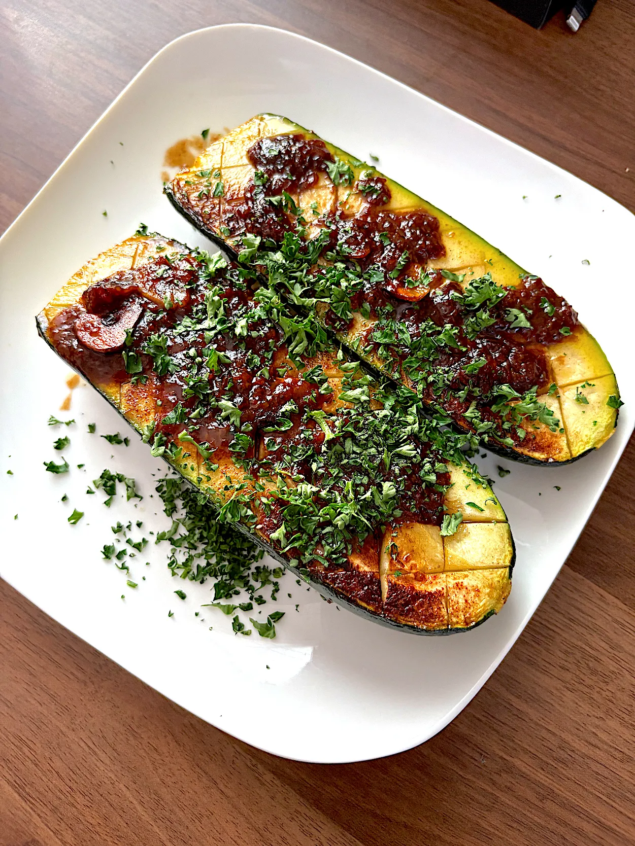旬なズッキーニをソテー。断面を焼き色つけて蒸し焼き。その後バター、ニンニク、醤油を加えて煮詰める。旨みと食感最高!