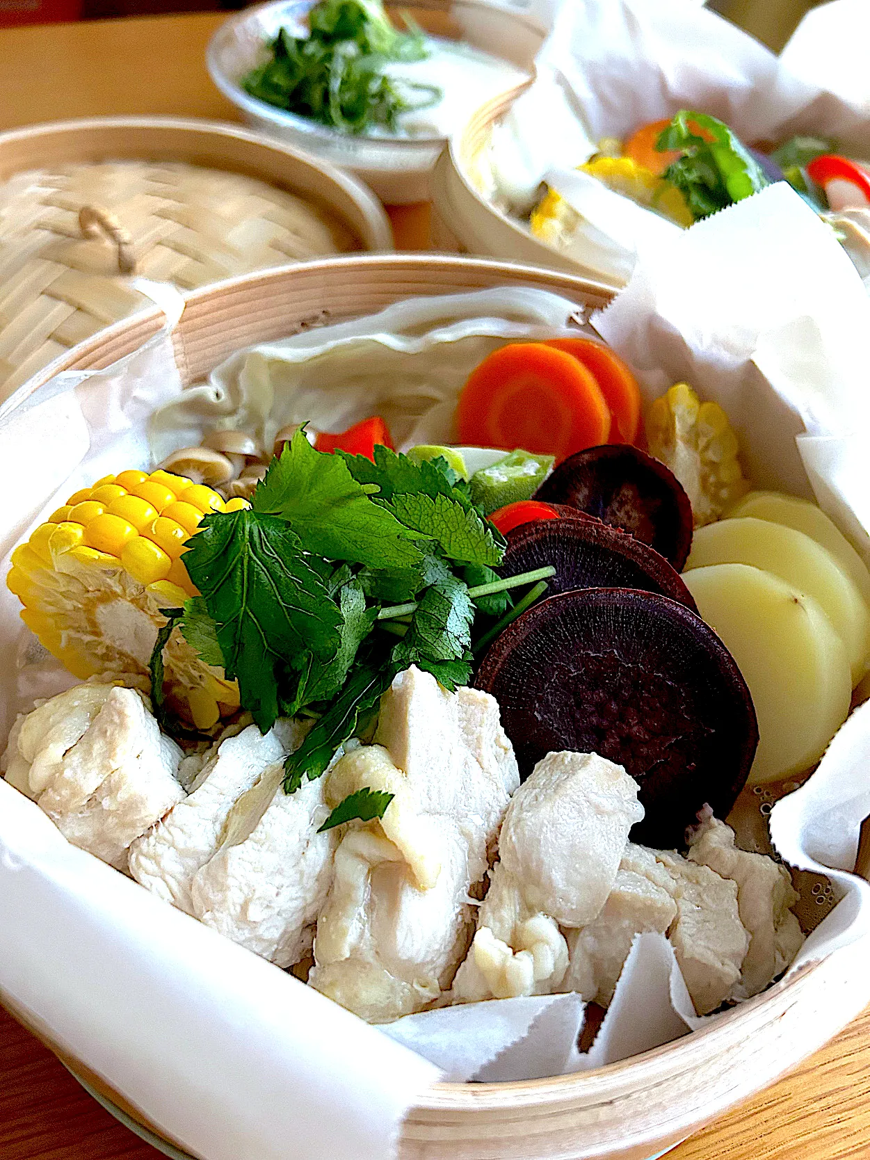 塩糀に漬けた鶏胸肉、紫芋にじゃがいも、とうもろこし、人参、パプリカ、しめじ、三つ葉👍