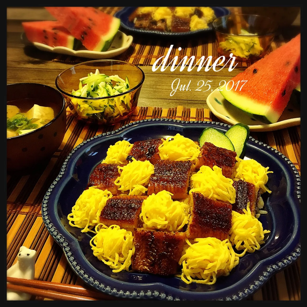 今日はうなぎ丼、豆腐のお吸い物、きゅうりと山芋のサラダ、スイカです。