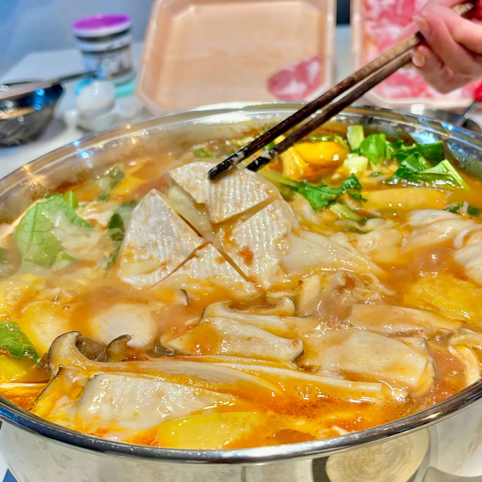#鶏肩 #白菜 #豆腐 #舞茸 #しめじ #エリンギ #豆苗 #白ネギ #水菜 焼霜した#手羽元 #カマンベールチーズ