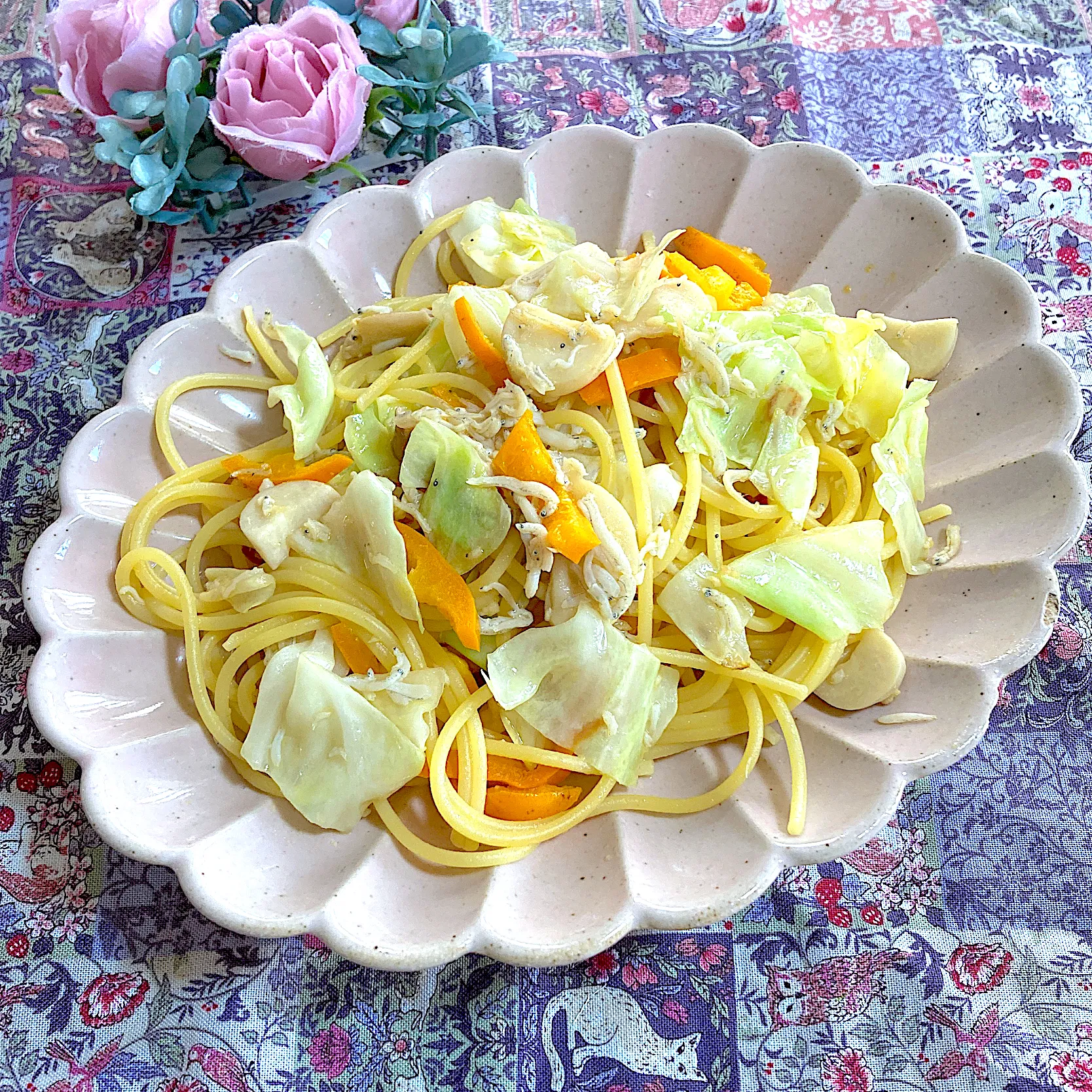 しらすにキャベツたっぷり入れて簡単にペペロンチーノ風にしました😄