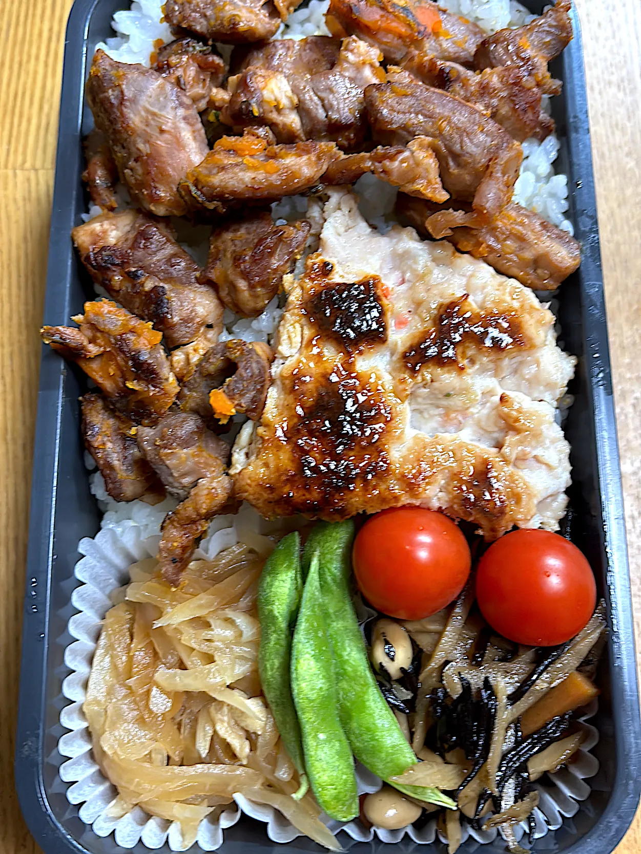 #男子弁当 #焼肉丼 #鶏バーグ #つき大根 #ひじき煮