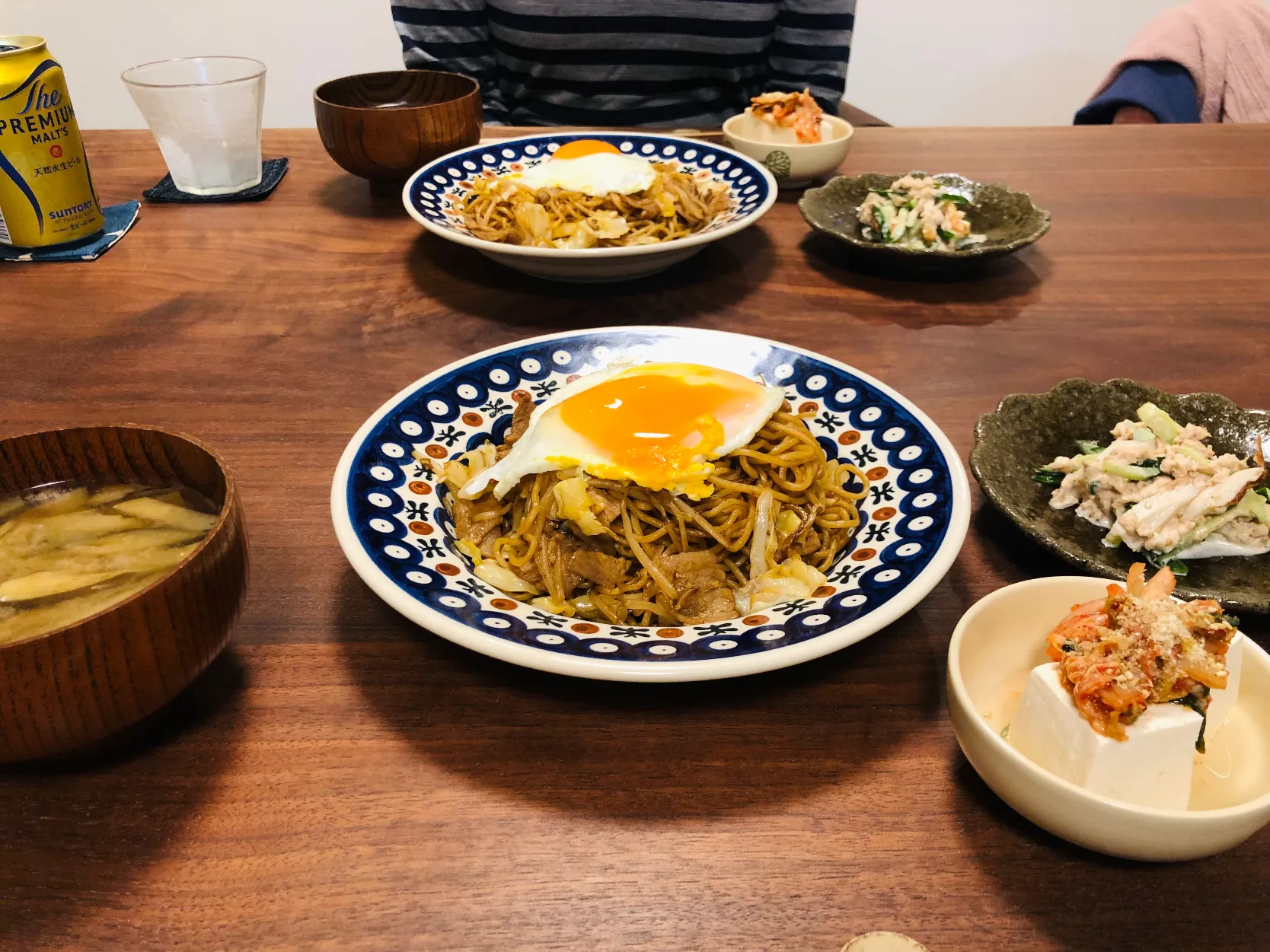 焼きそば、ツナとキュウリの和え物、キムチ冷奴、ナスと茗荷の味噌汁