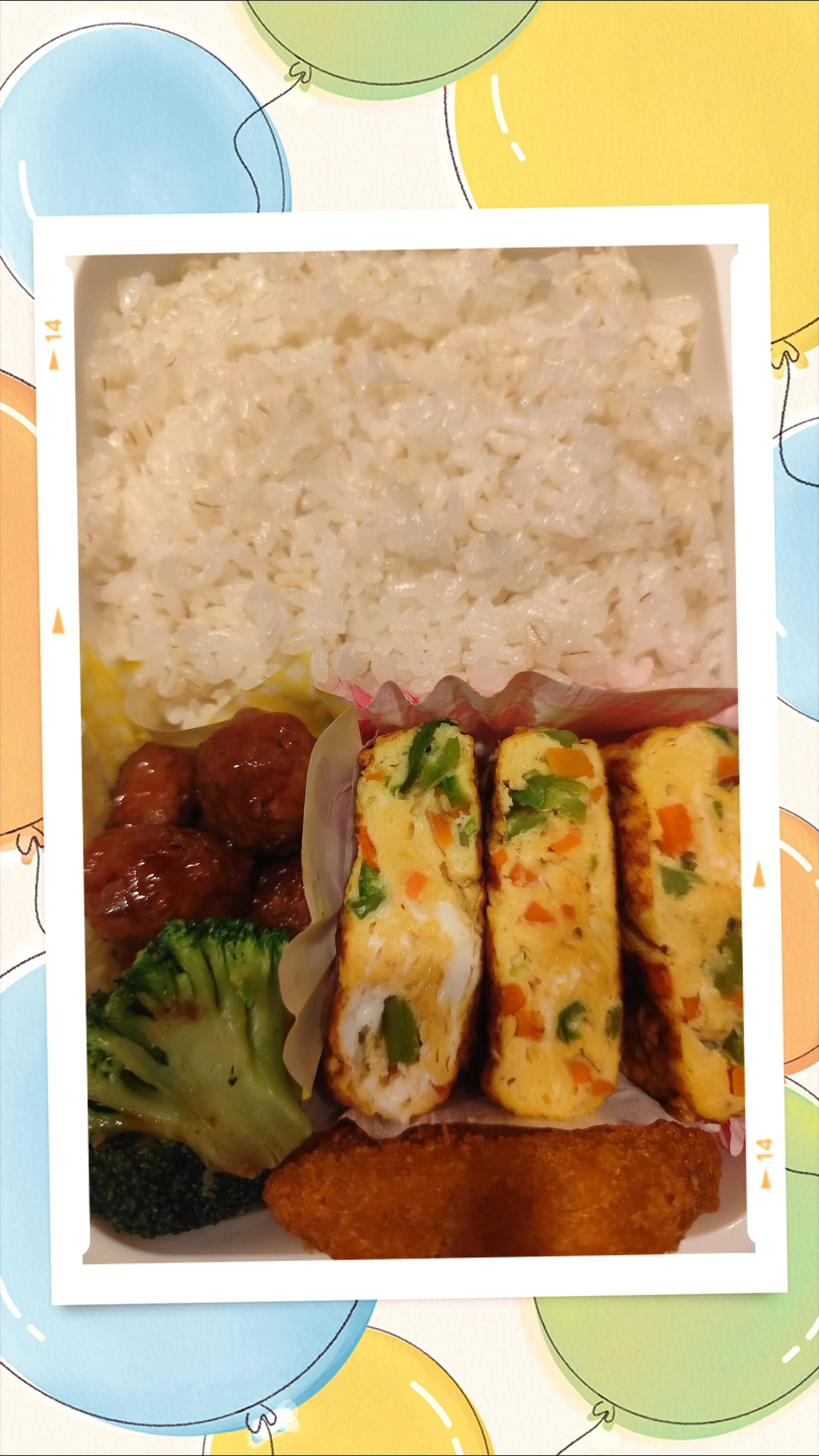 李錦記オイスターソース、ハーフマヨネーズ味の卵焼き(人参ピーマン入り)、市販ミートボール、冷凍ブロッコリー焼いたのと生協冷凍コロッケ、ビタバァレーご飯。