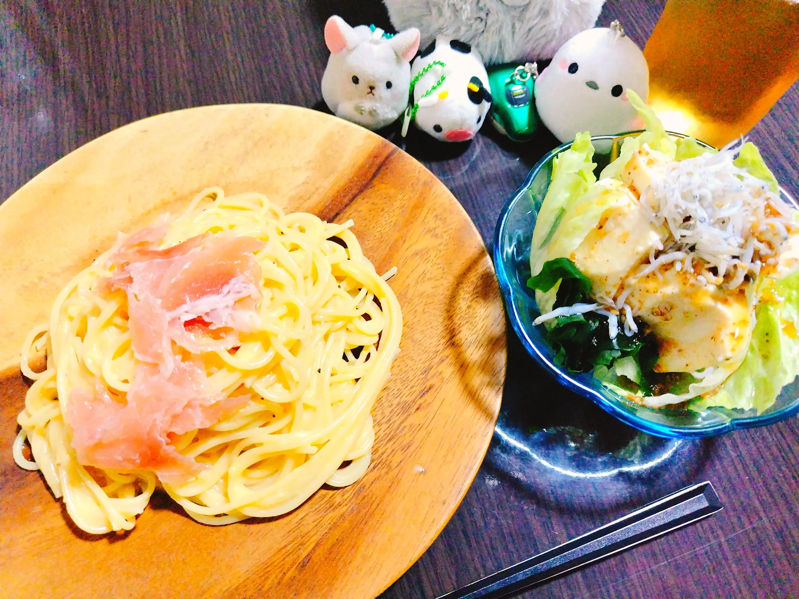 カルボナーラ風パスタ、豆腐とわかめとシラスのサラダ