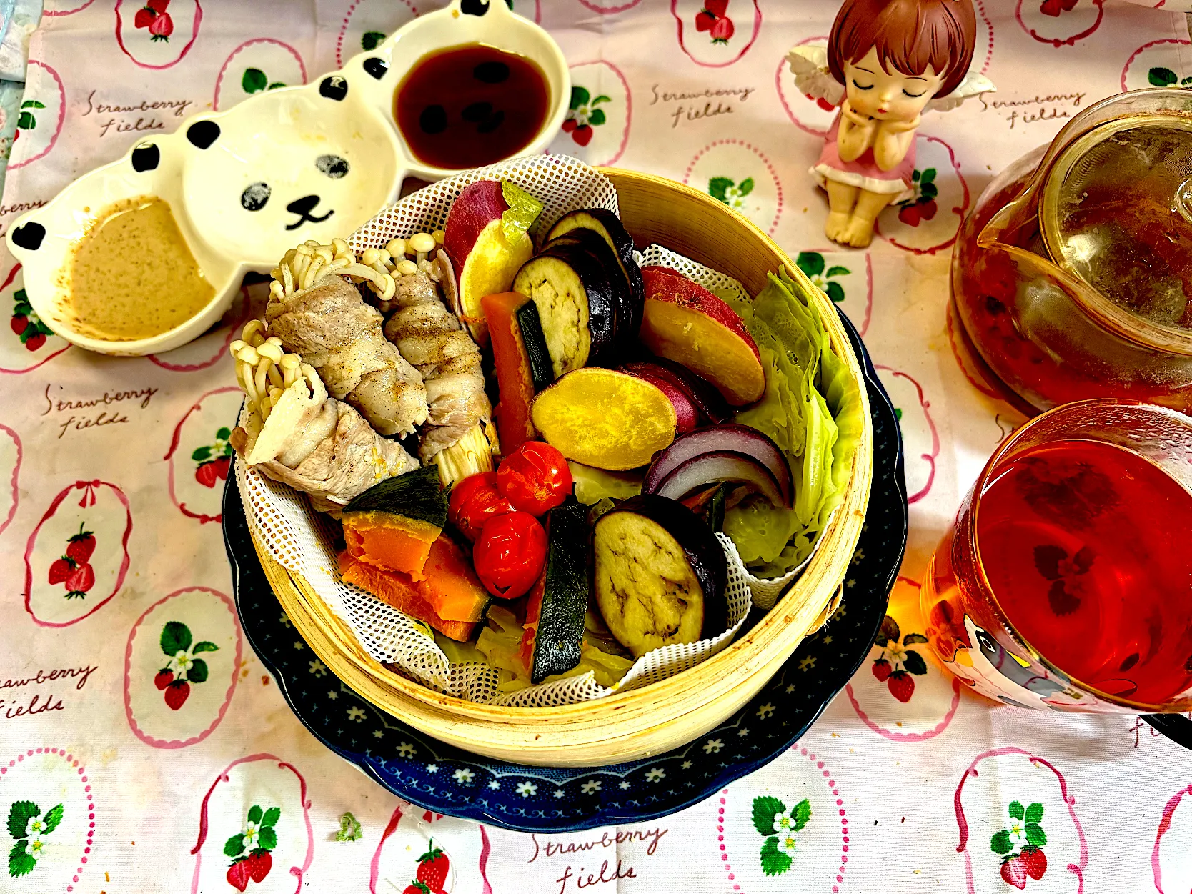 えのきの豚バラ巻き、紫玉葱、キャベツ、南瓜、さつま芋、トマト