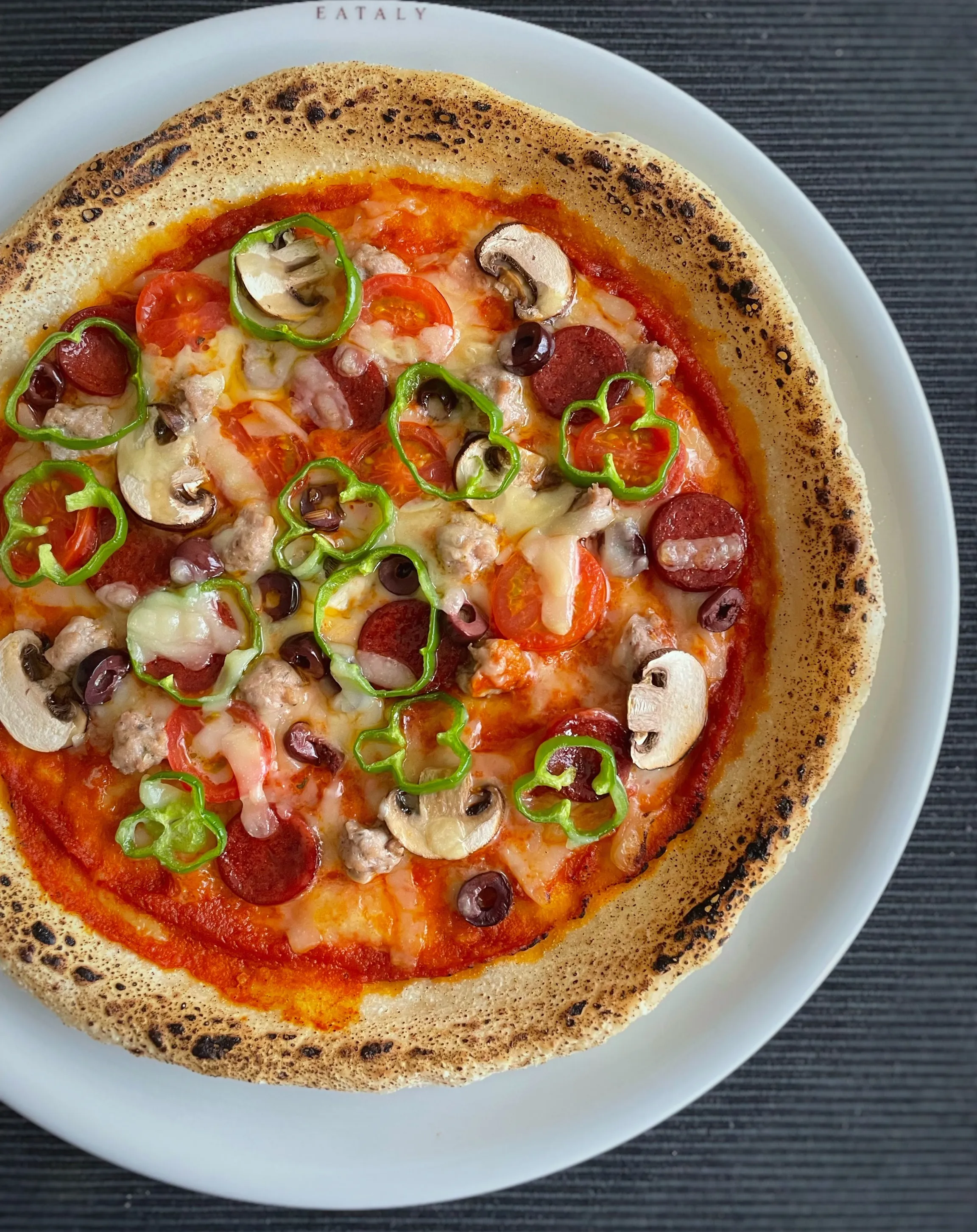 ピーマン、ブラックオリーブ、トマト、マッシュルーム、サラミ、サルシッチャ。