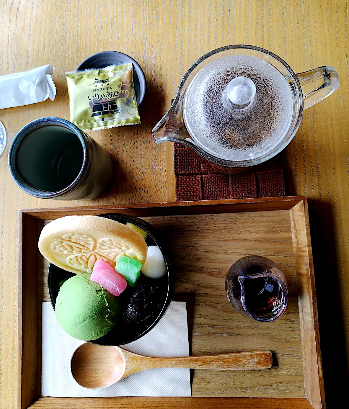 今日は徳川園に冬牡丹を愛でに行きました。徳川園を出た後、お隣の「蘇山荘」さんでぼくは白玉クリームあんみつと生姜ほうじ茶を、