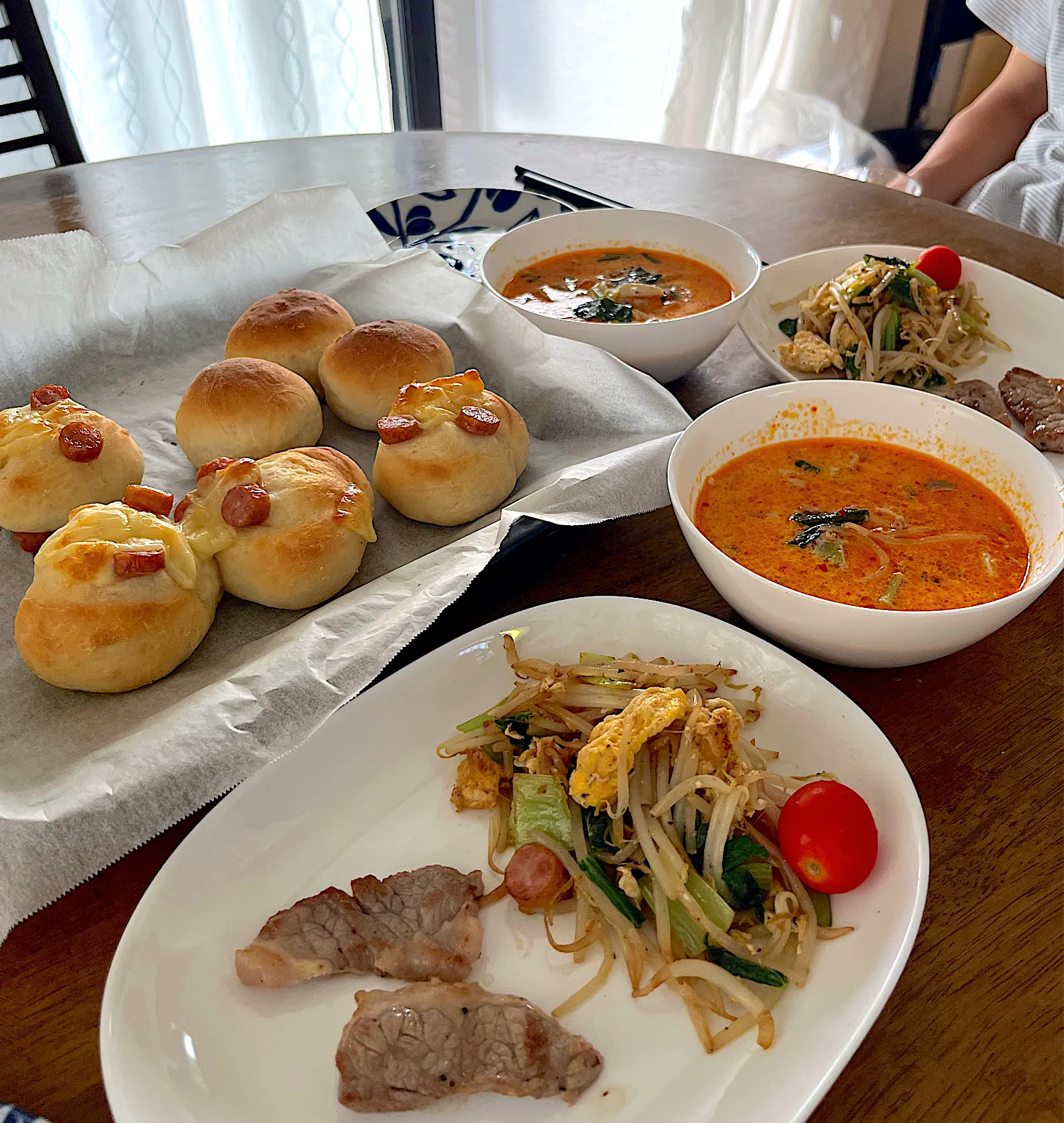 あとは、坦々スープ、昨夜の残りのステーキ、残り物野菜炒めです🤭