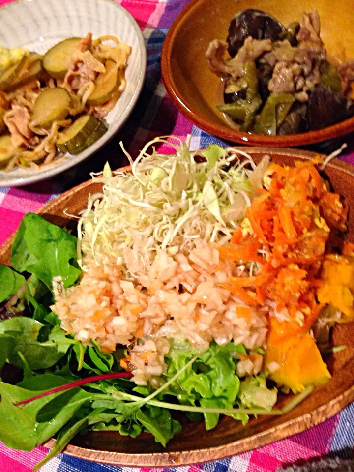 お夕飯 鰹のたたき・カボチャサラダ・厚揚げお好み焼き...