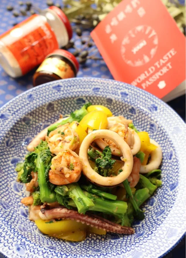 ほろ苦菜の花にイカやエビもよく合うね😋