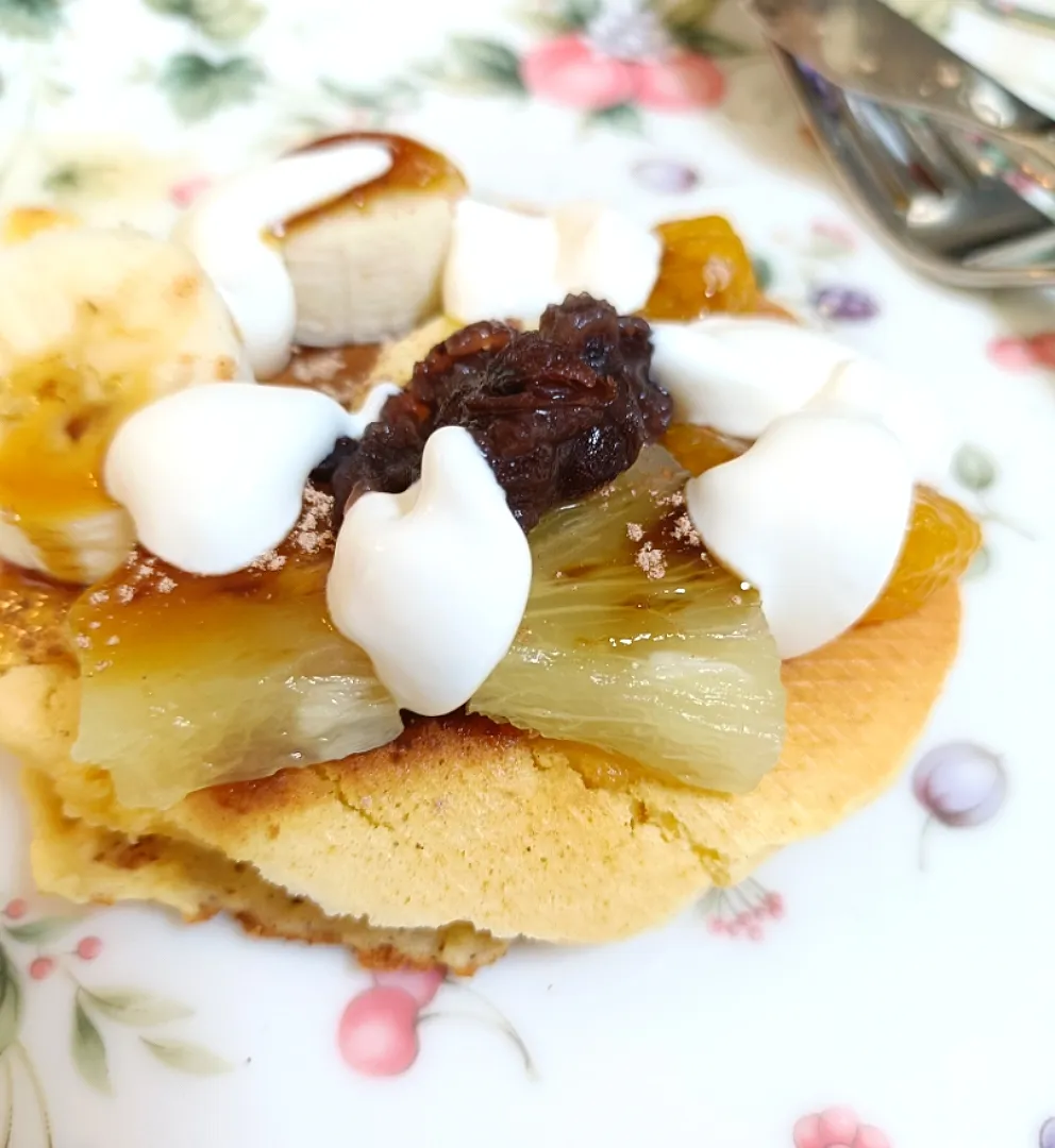 #ホットケーキ#パイナップル#ホイップクリーム#みかん#バナナ#粒あん#バター#黒蜜
