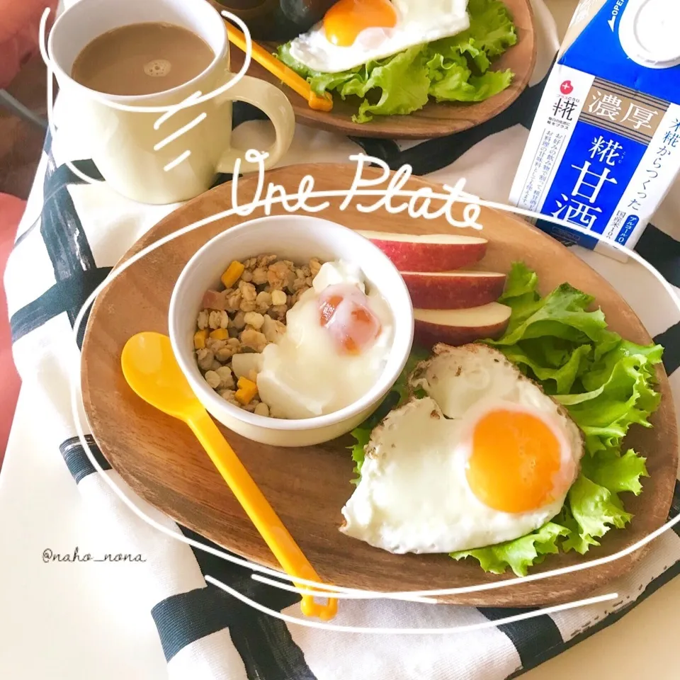 今日はワンプレート朝ごはんです。ヨーグルトが目玉焼きのように見えますけど…笑