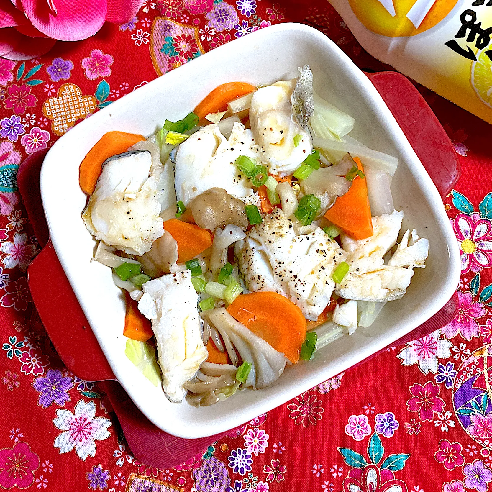 鱈🐟に野菜色々入れて簡単にレンジ蒸ししました😄
