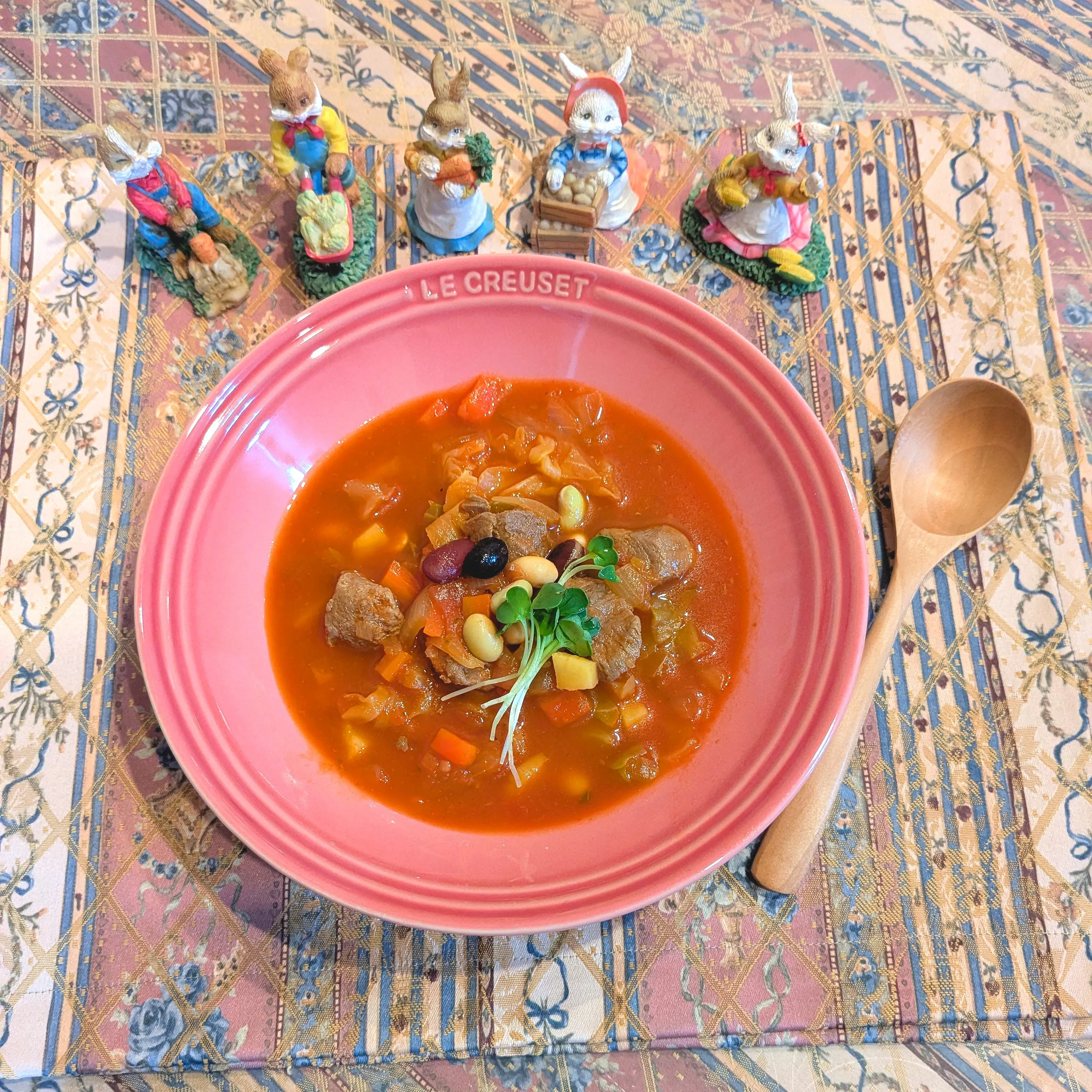 寒い日に、牛肉入りお野菜たっぷりミネストローネです🍲