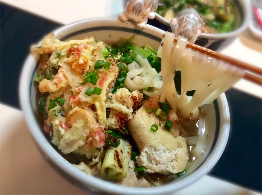 具沢山きしめん 鶏肉、お揚げさん、かき揚げ、焼きねぎ、小松菜、わけぎ、煎りたてのゴマ、おろし生姜で。出汁は、焼き顎、粉鰹、昆布であっさりと^_^