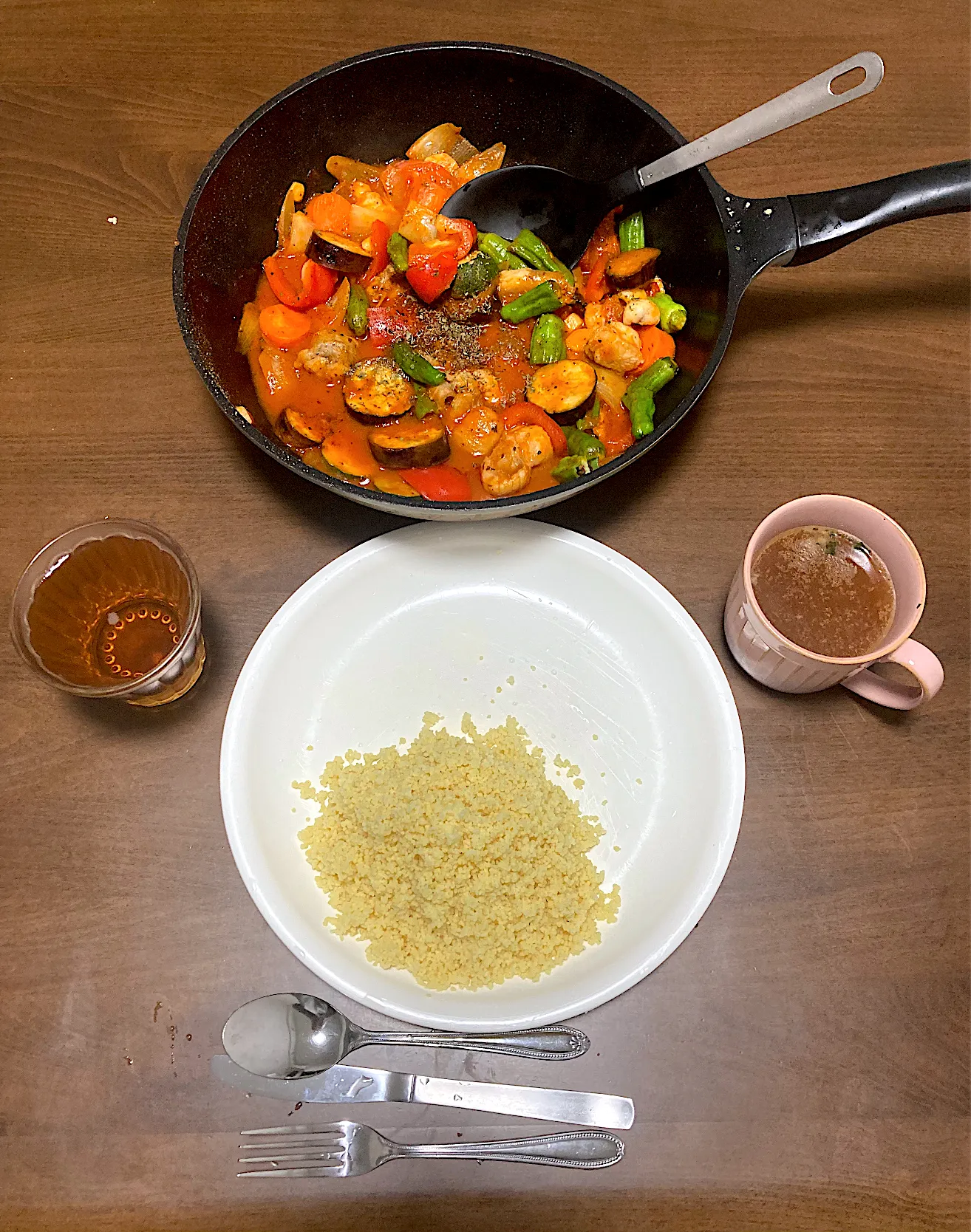 今日の晩ご飯 アンコウ入りラタトゥイユ、クスクス添え オニオンコンソメ(クノールカップスープ) 昨日のラムチョップのローストに添えた彩り野菜と先日のアンコウ鍋の時に後から買ったあん肝付きアンコウ鍋セットにスクイーズアウトされたアンコウの切り身(冷凍保存)の消費メニューです。アンコウの、切り身はもう一パック残ってます💦