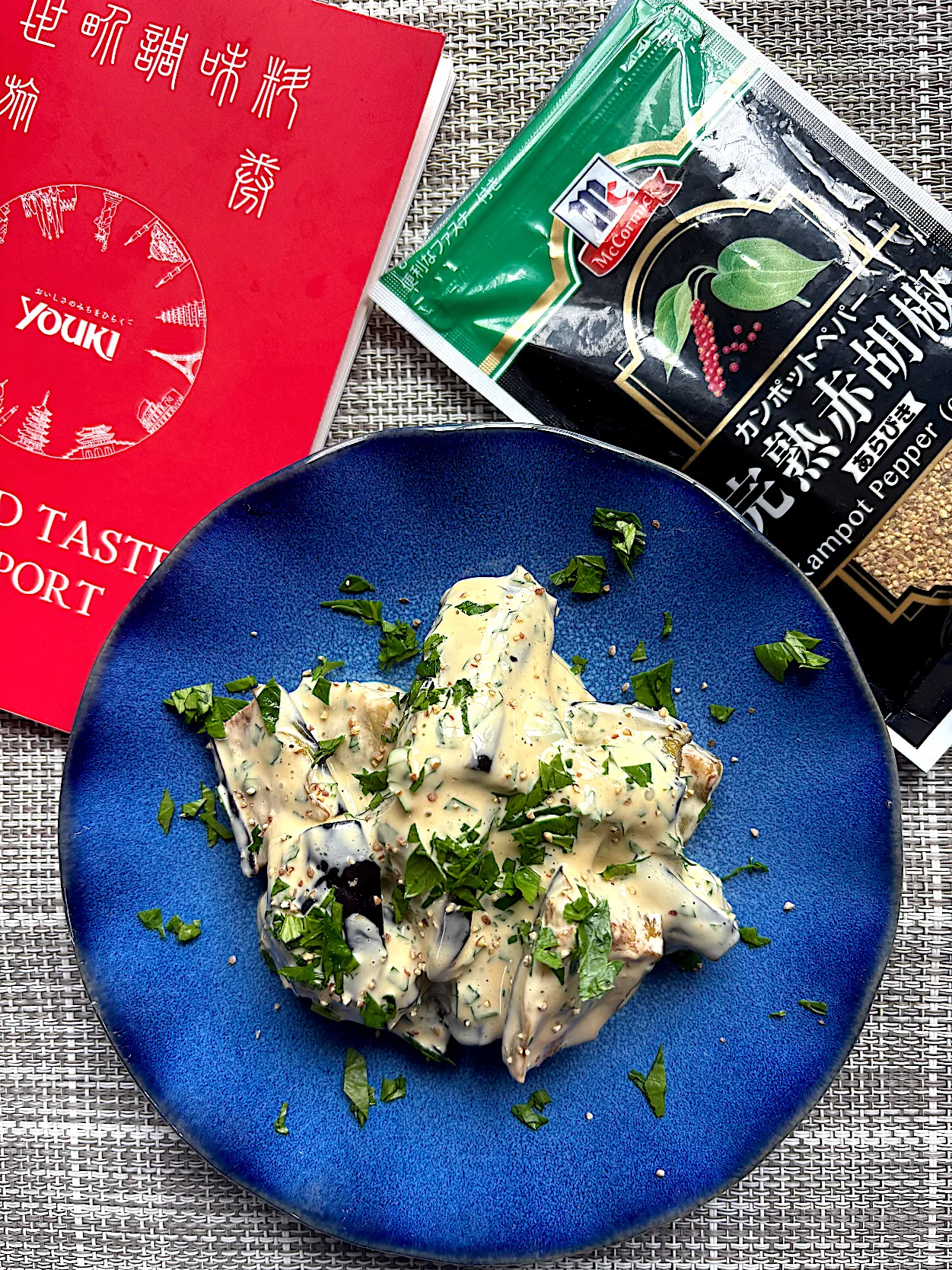 マヨネーズにセロリの葉の香りとチリパウダーとカンポットペッパーの爽やかなピリッとを加えたナスのピリ辛マヨ和え。