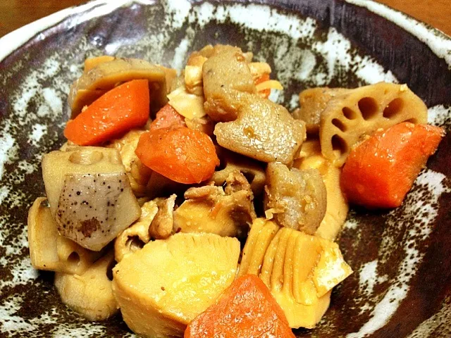 レンコン、タケノコ、かしわの炊き合わせ