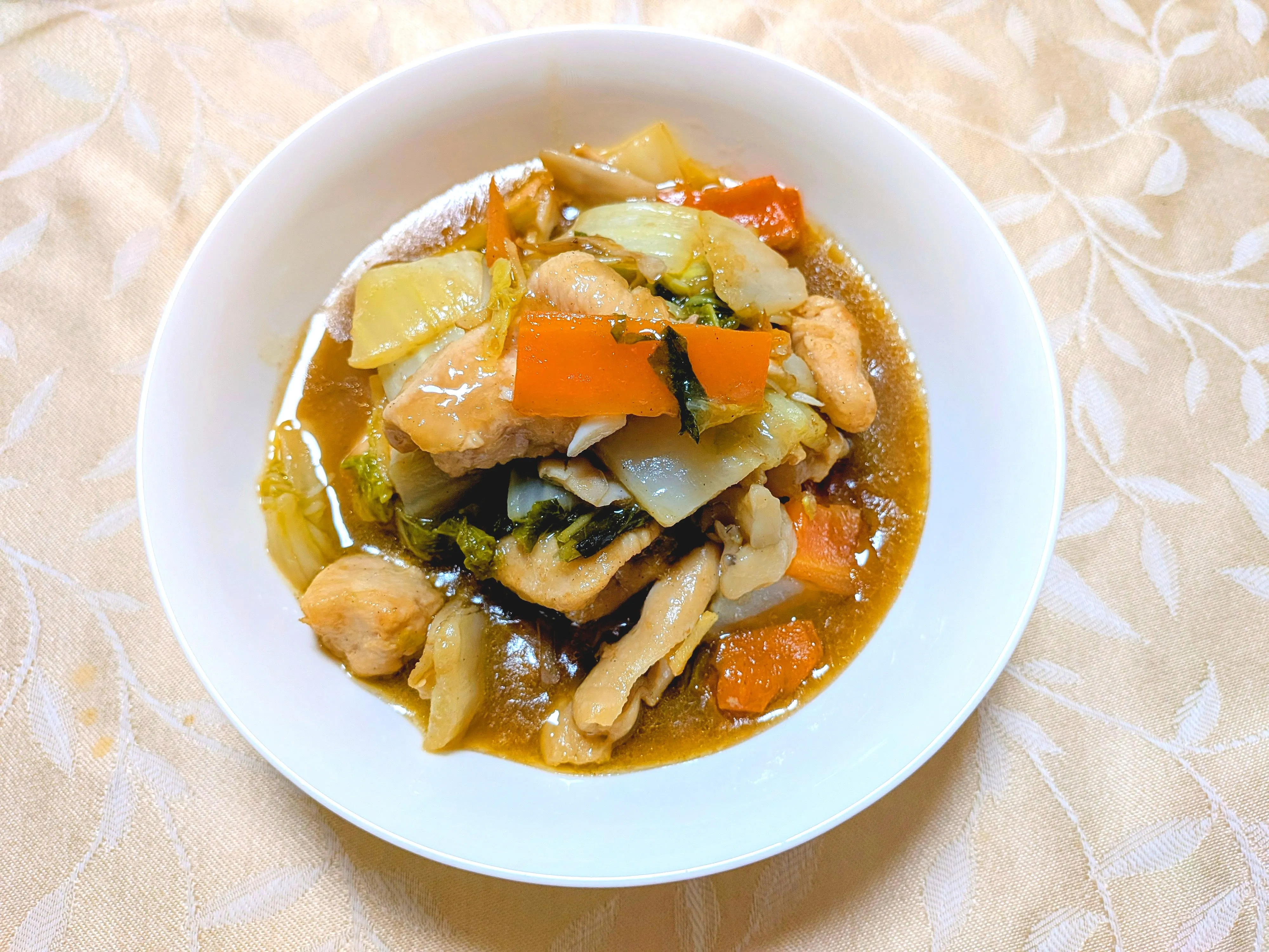 拍子切りのにんじんと白菜は根元の部分から先に炒めて、柔らかい葉の部分を最後に入れ炒め煮にしました。