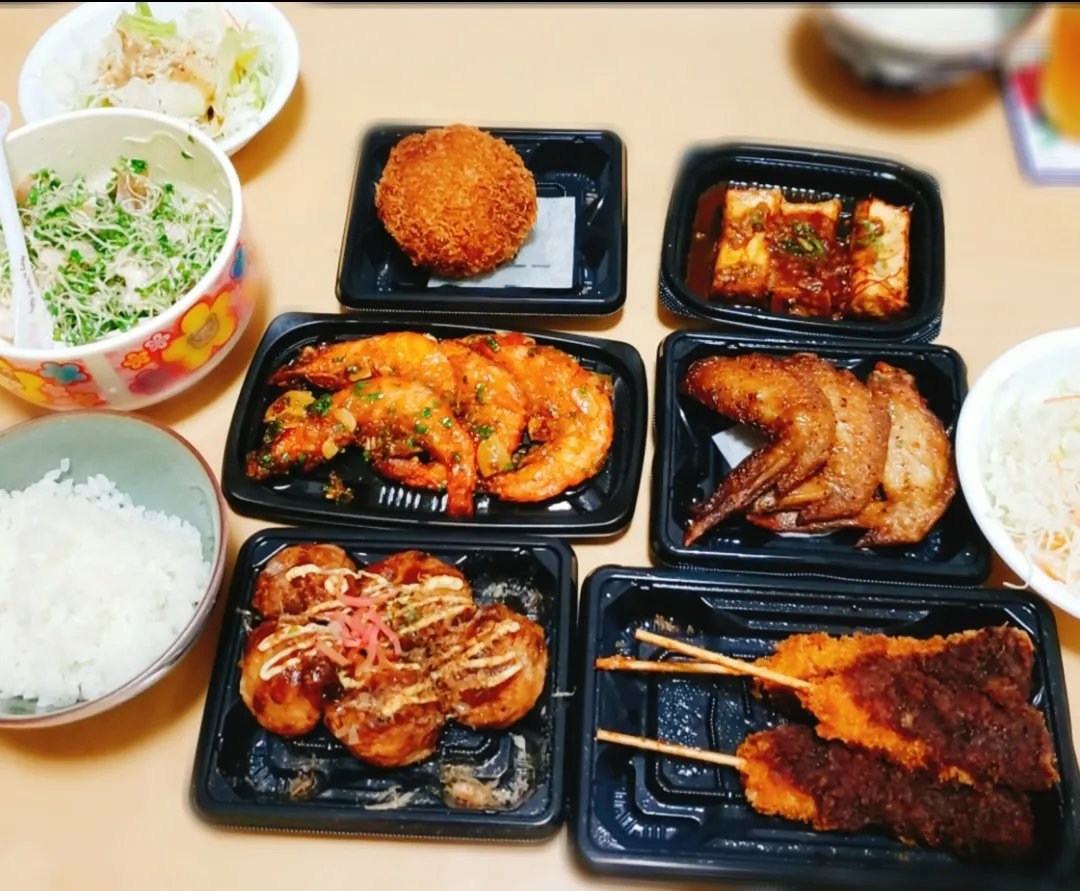 #メンチカツ #肉味噌豆腐 #ガーリックシュリンプ #手羽先唐揚げ #たこ焼き #豚揚げ串 #ハムスプラウト #キャベツミックスサラダ #ご飯 #半額 お惣菜