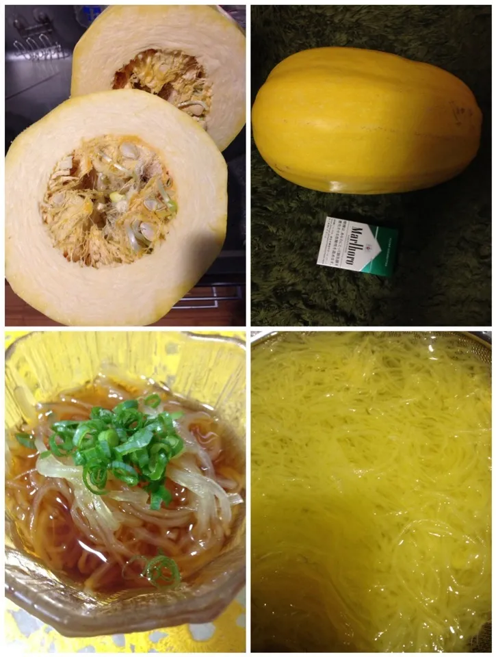 そうめんかぼちゃを輪切りに切って、ゆでて水にさらしてほぐすと、そうめんみたくなるかぼちゃです。