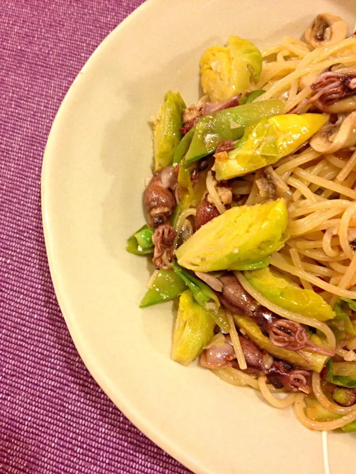 ホタルイカと芽キャベツのペペロンチーノ
