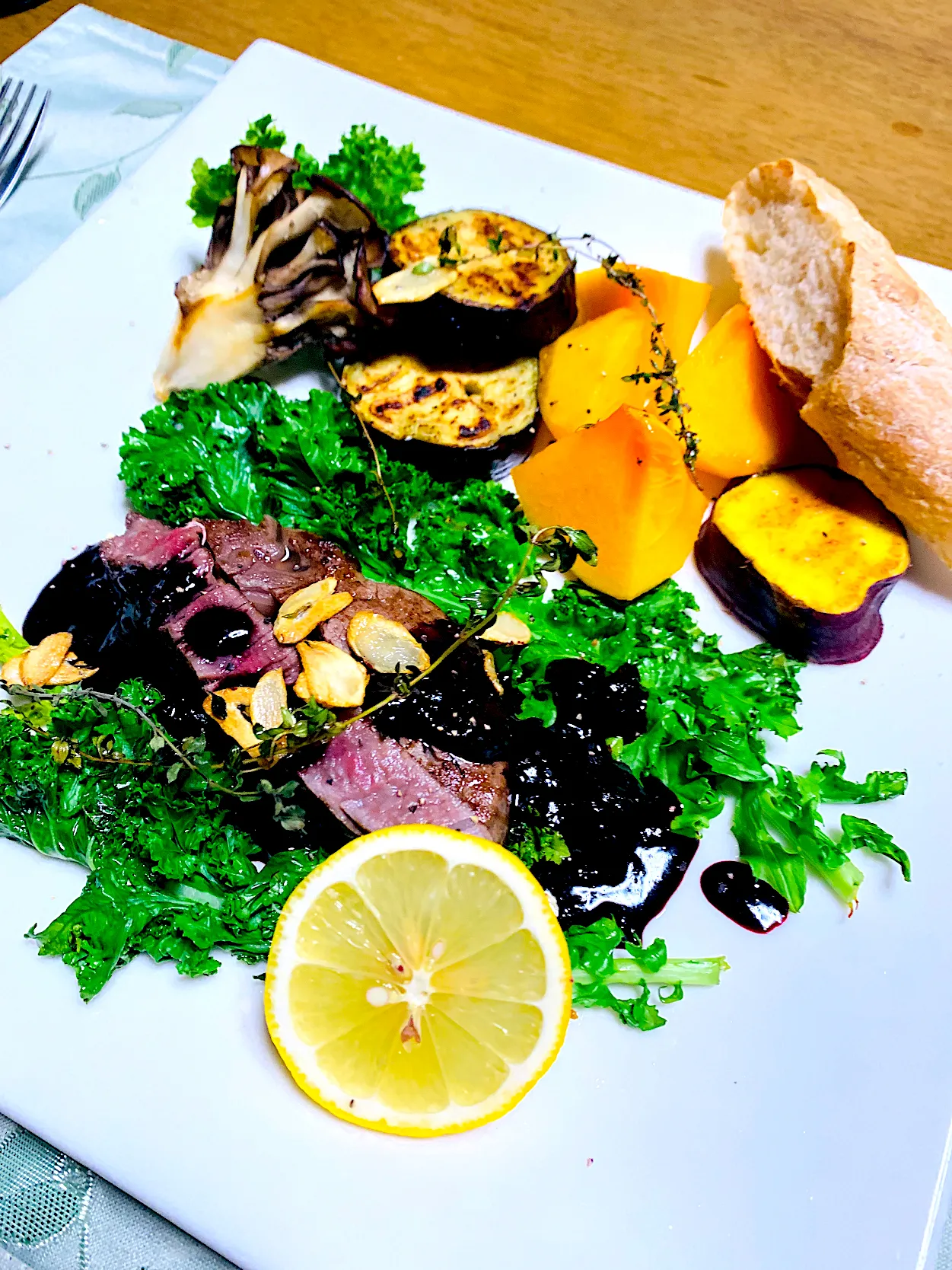 仙台牛ヒレステーキ ブルーベリーソース 冷凍保存して置いたブルーベリーに赤ワイン、しょうゆでソースを作りました❣️ やっぱりA5のヒレでも脂が多く感じます૮( ̳ т ̫ т ̳ )აなのでこの程よく酸味を感じるソースがピッタリ✨なんです 自家製全粒粉入フランスパンを添えて❣️