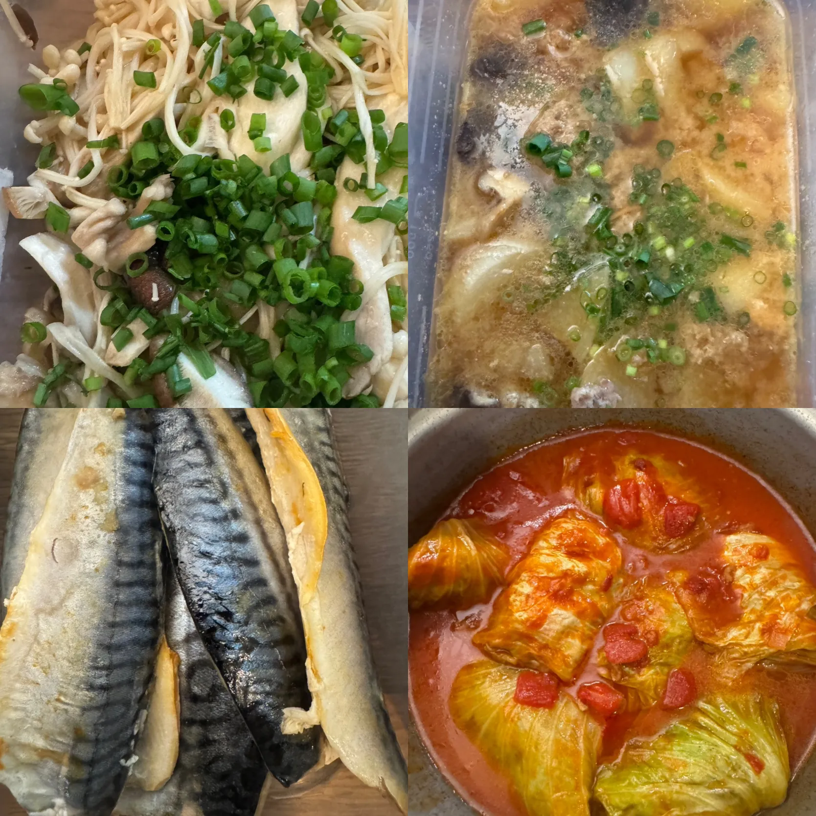きのこマリネ、蕪と肉団子スープ、焼き鯖、ロールキャベツ