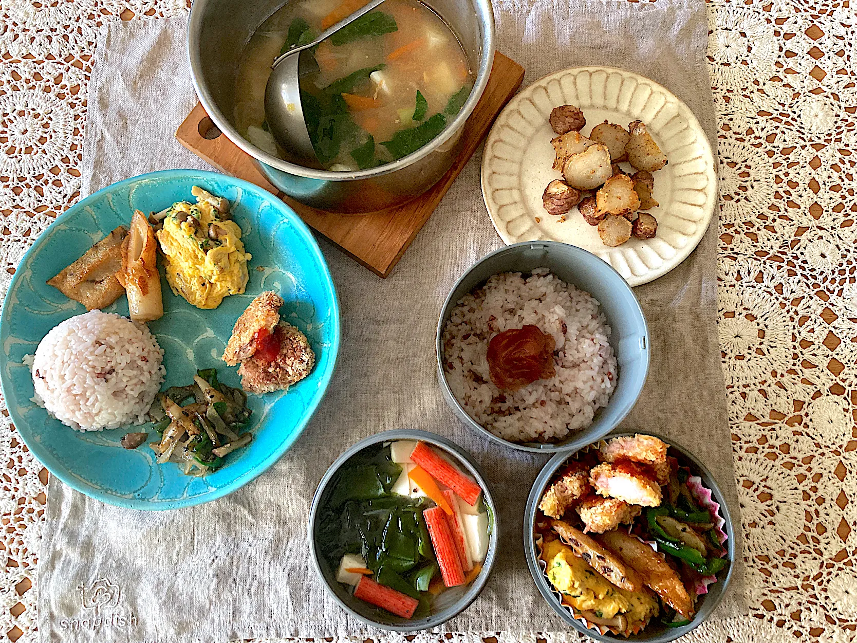 朝食用〜トンカツの油でついでに揚げた菊芋の唐揚げ、小松菜お豆腐ネギ玉ねぎ人参つくね芋のお味噌汁に乾燥しじみと鶏そぼろの残りを入れて冷や汁の素を入れた具沢山なお味噌汁。