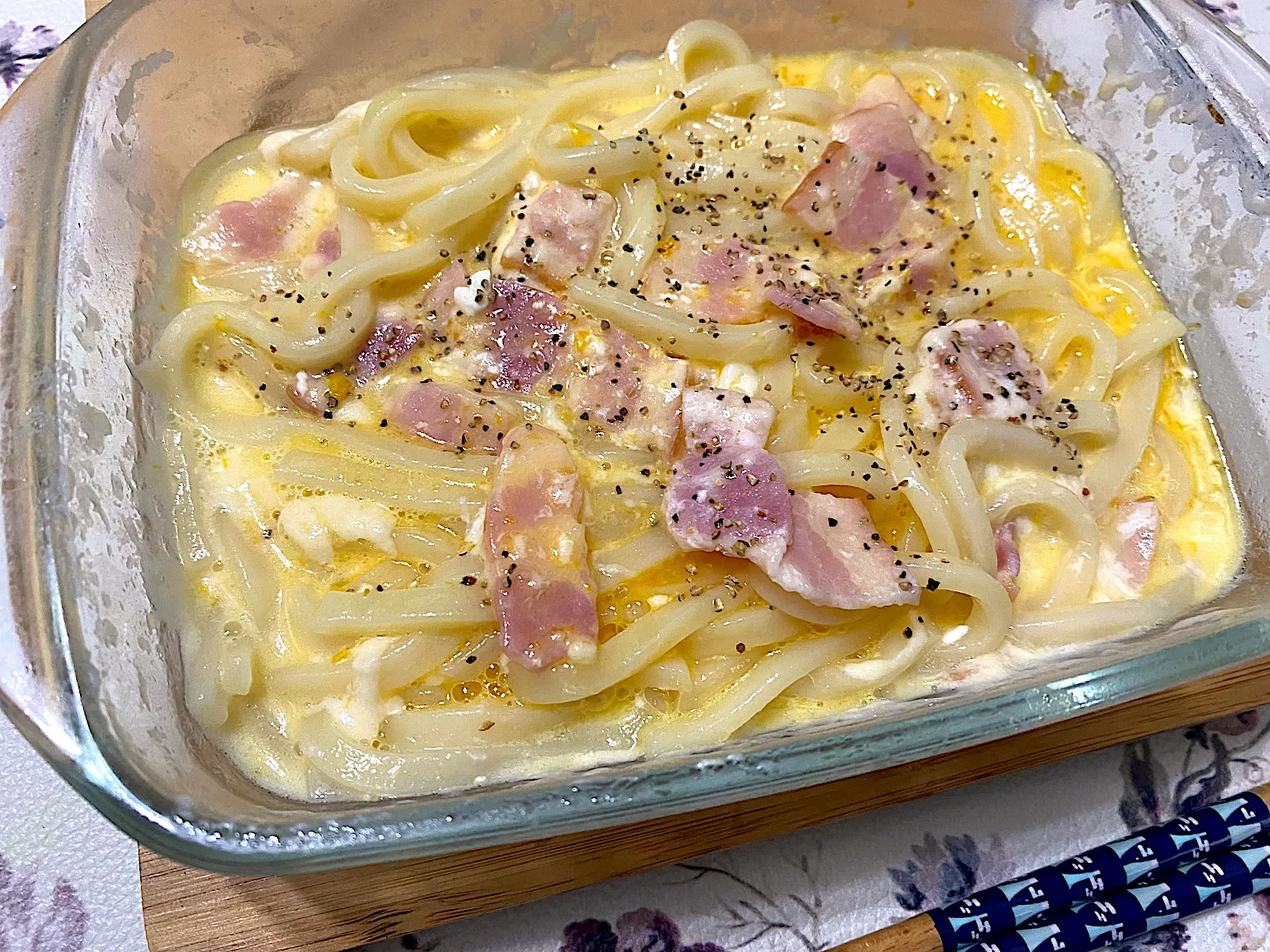手軽にできるカルボナーラ風うどんです✨ 牛乳、ピザ用チーズ、白だし、ベーコンを適度に入れて、その上に冷凍うどんを乗せてレンチン。仕上げは卵と黒胡椒。若干薄味だったのでマヨを少し足したらコクがでて美味しくなりました😊 忙しいときにこれは使えるな〜