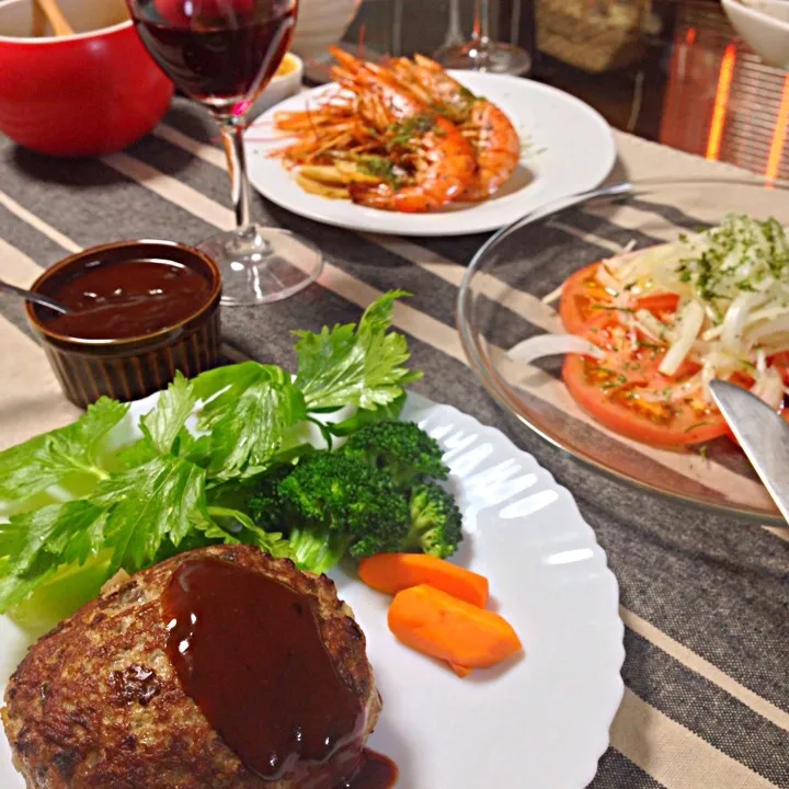 手こねハンバーグ、海老のアンチョビバターソテー、トマトとオニオンのサラダ