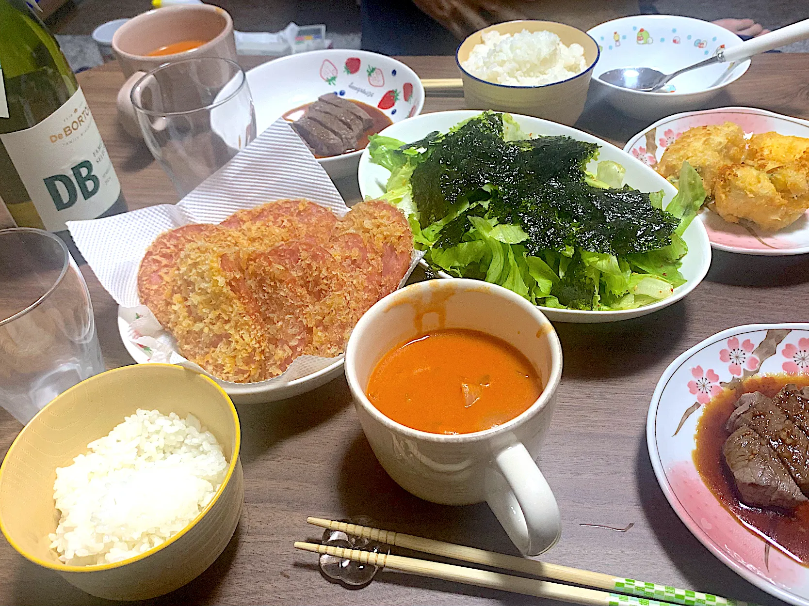 ハムカツ、ササミの大葉チーズ揚げ、チョレギサラダ、和牛ステーキ、あさりのトマトクリームスープ