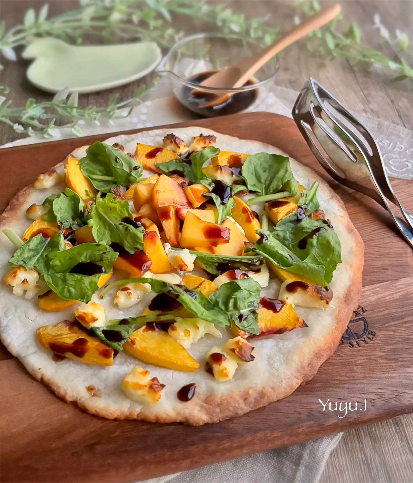#フルーツピザ #桃 #黄桃 #ピザ #米粉 #薄焼きピザ #クリームチーズ #ルッコラ #バルサミコ #減塩しょうゆ