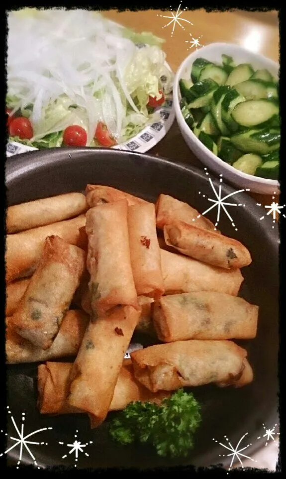 にらともやしとひき肉と諸々を、フカヒレスープの素で味付けして春巻の皮に巻いて揚げました(・ω・)ノ