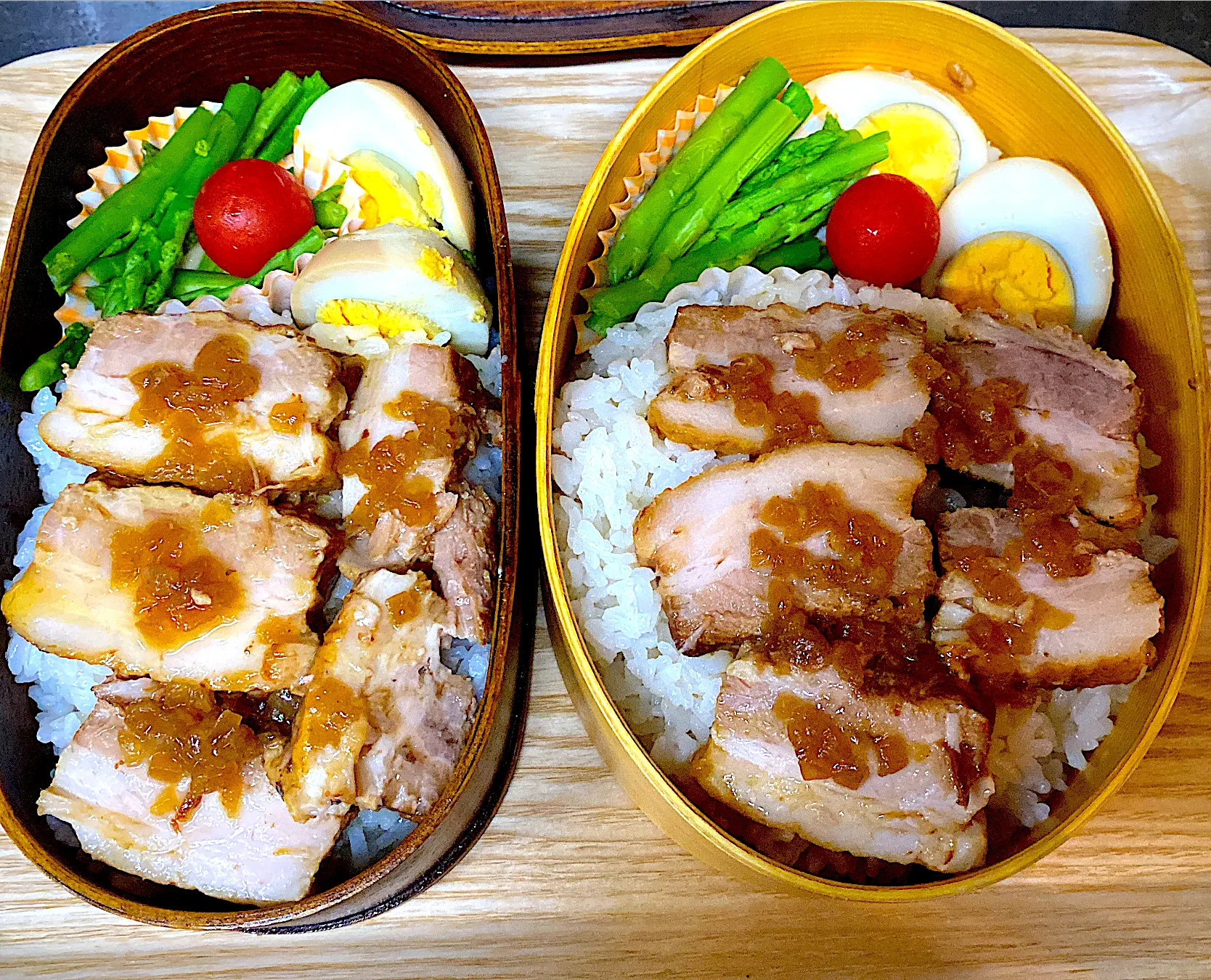 自家製チャーシュー玉ねぎだれ、味玉、新鮮アスパラ。明日が中学生ラスト弁当!頑張れ私