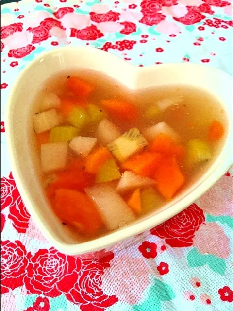 スープは蓮根の澱粉です、くず湯と似ている。梨とパパヤとキウイを入れた。