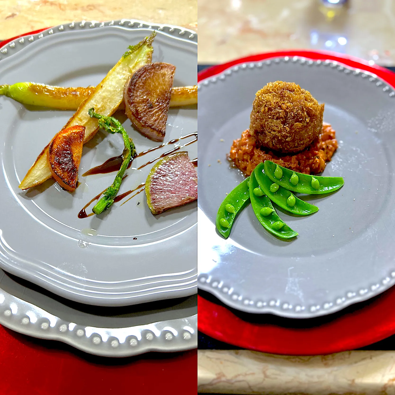 珍しく丸いメンチカツを作ったのでディナー🍽️用にグリル野菜と春野菜を添えてみました