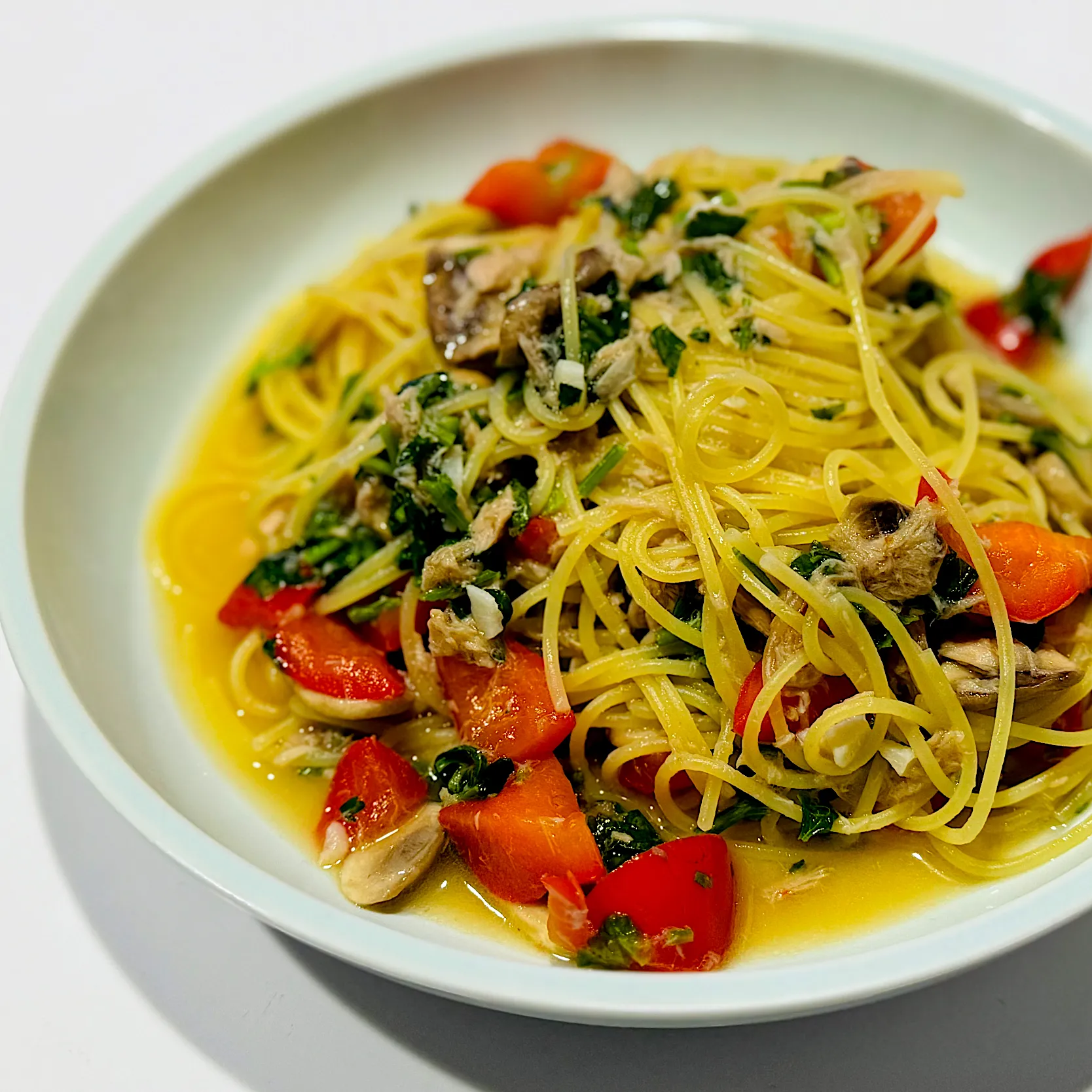 少しだけナンプラーを加えてアジアぽく仕上げます #パスタ #ツナ #シーチキン #パクチー #パプリカ #マッシュルーム