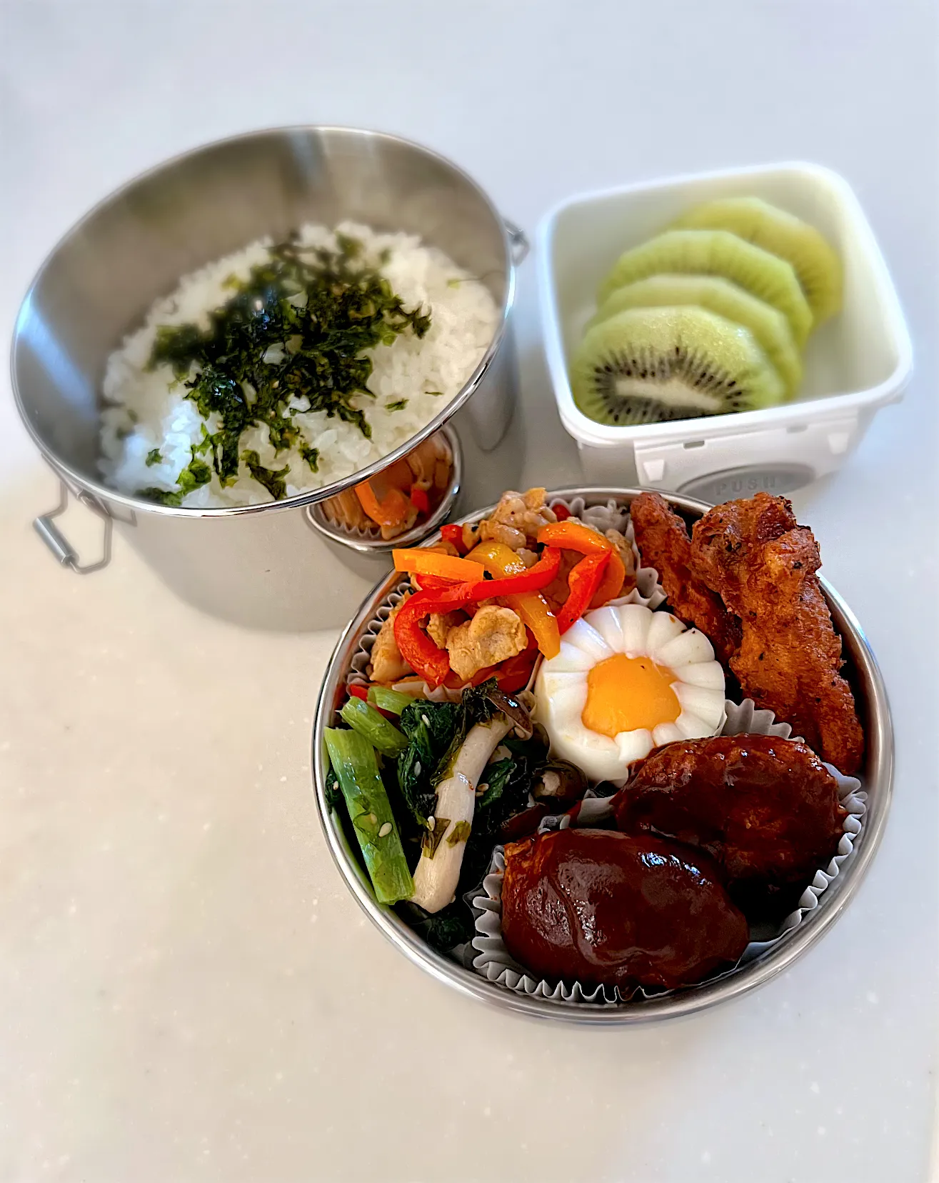 お弁当見た息子、見た目では気付かなかった。よしよし。出た!同じ野菜地獄!とだけ🥹味付け変えたんだからいいじゃないと渡しました。帰ってきたらハンバーグの感想聞こう。楽しみ🎵