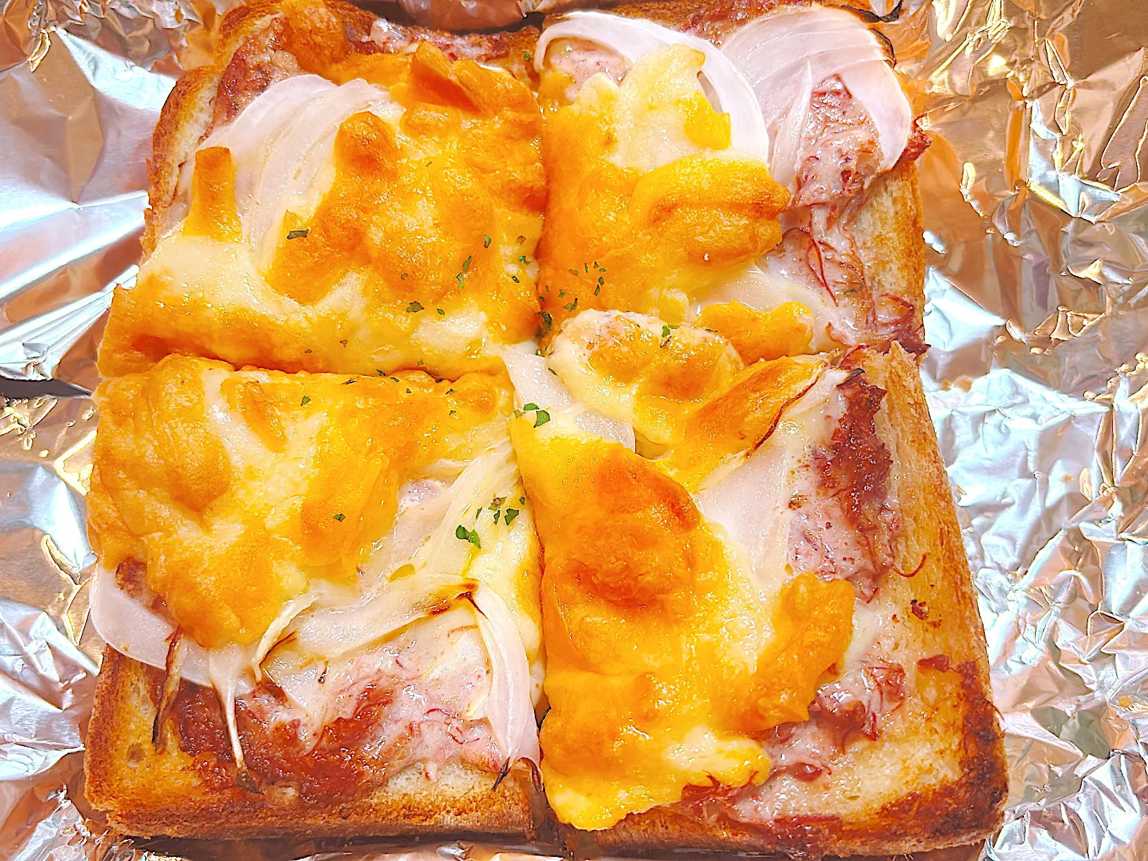 うろ覚えだけど、コンビーフにマヨと玉ねぎ、私オリジナルでチーズをのせて焼きました。んまー。ほんとはコンビーフとじゃがいもでグラタン作りたかったんだけどね。食パン消費週間なので仕方ない笑 #ゆうかりんクッキング