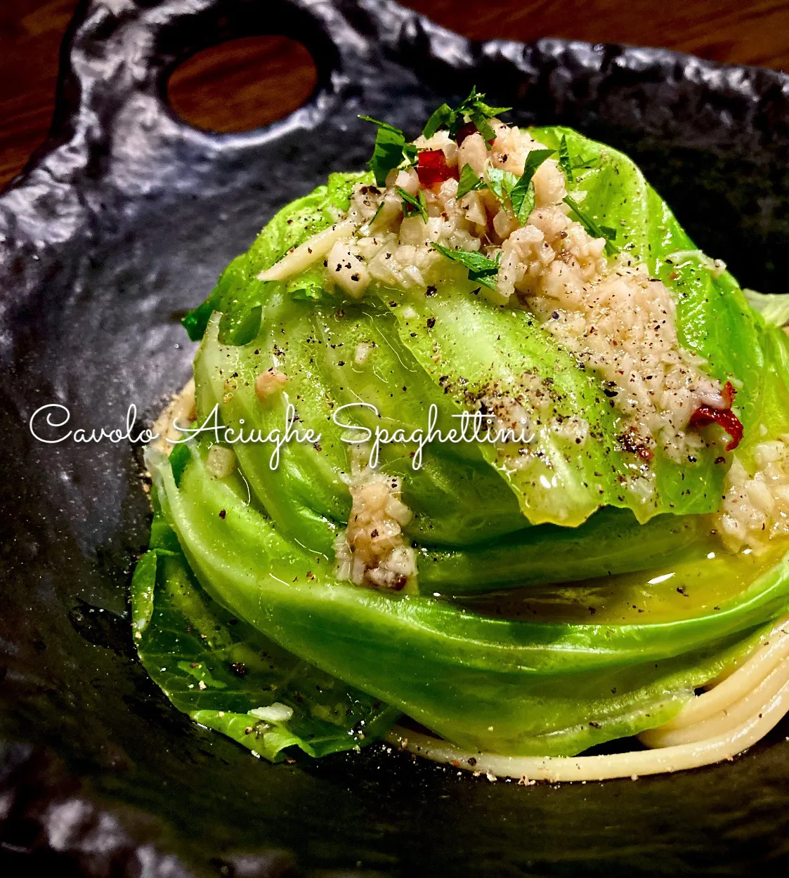 キャベツの下にはアンチョビソースが絡まったペペロンチーノ🇮🇹